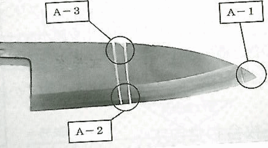 Während der Schneidebereich aus Martensit besteht, ist seine nadelförmige Struktur im Vergleich zu den anderen gröber. Darunter liegt Sorbit, und in der Makrostruktur ist ein weißer Bereich nahe der Mitte sichtbar, der wahrscheinlich Perlit mit verstreutem Ferrit entspricht.
