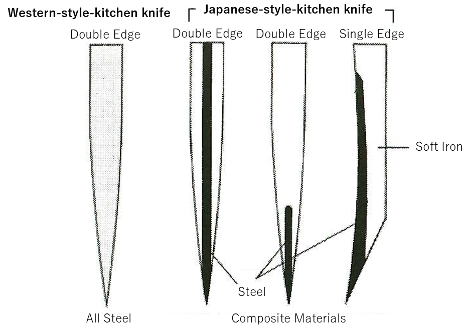 Wie hier gezeigt, werden westliche Messer im Allgemeinen aus einem einheitlichen Stahlstück hergestellt. Im Gegensatz dazu gibt es bei japanischen Messern mehrere geschichtete Konfigurationen: