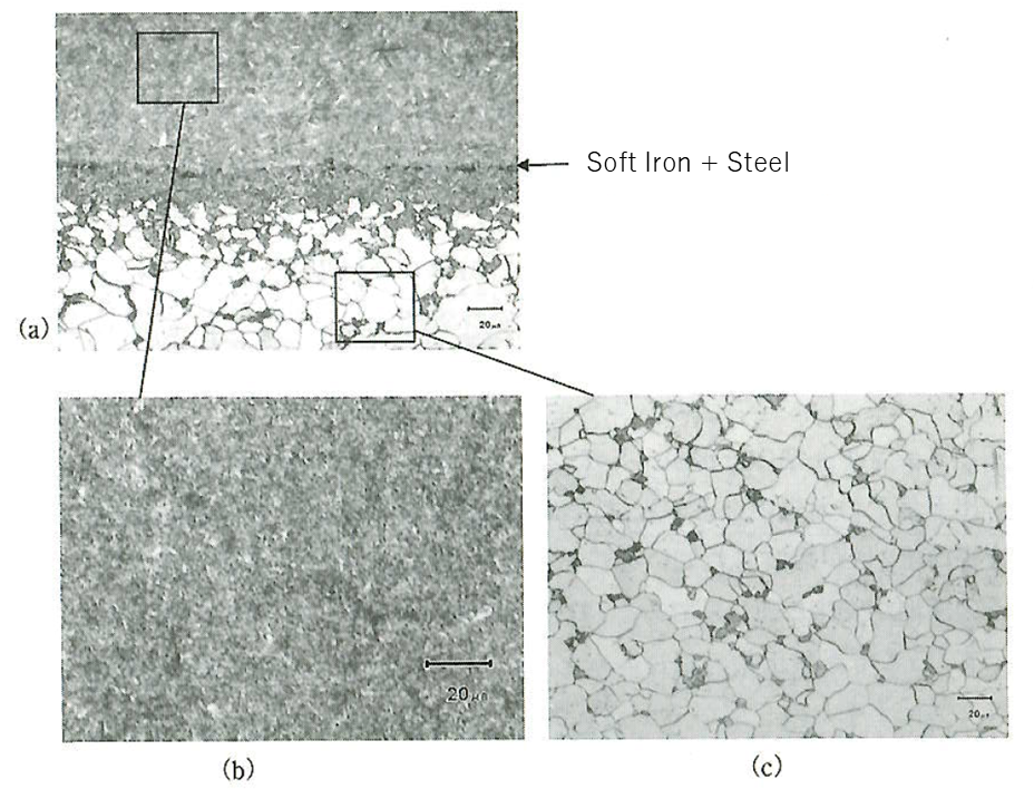 Foto(c)zeigt den Weicheisenbereich, der eine Ferrit + Perlit-Struktur aufweist, wobei Perlit etwa 5–8 % des beobachteten Bereichs ausmacht.