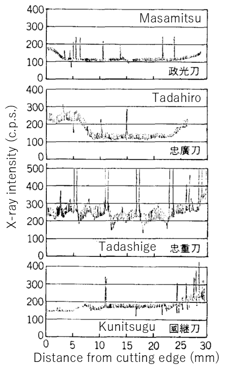 Darüber hinaus treten repetitive Schwankungen im Kohlenstoffgehalt alle 2–3 mm auf, die wahrscheinlich die Spuren des wiederholten Faltens und Schmiedens(Orikaeshi-Tanren) sind.