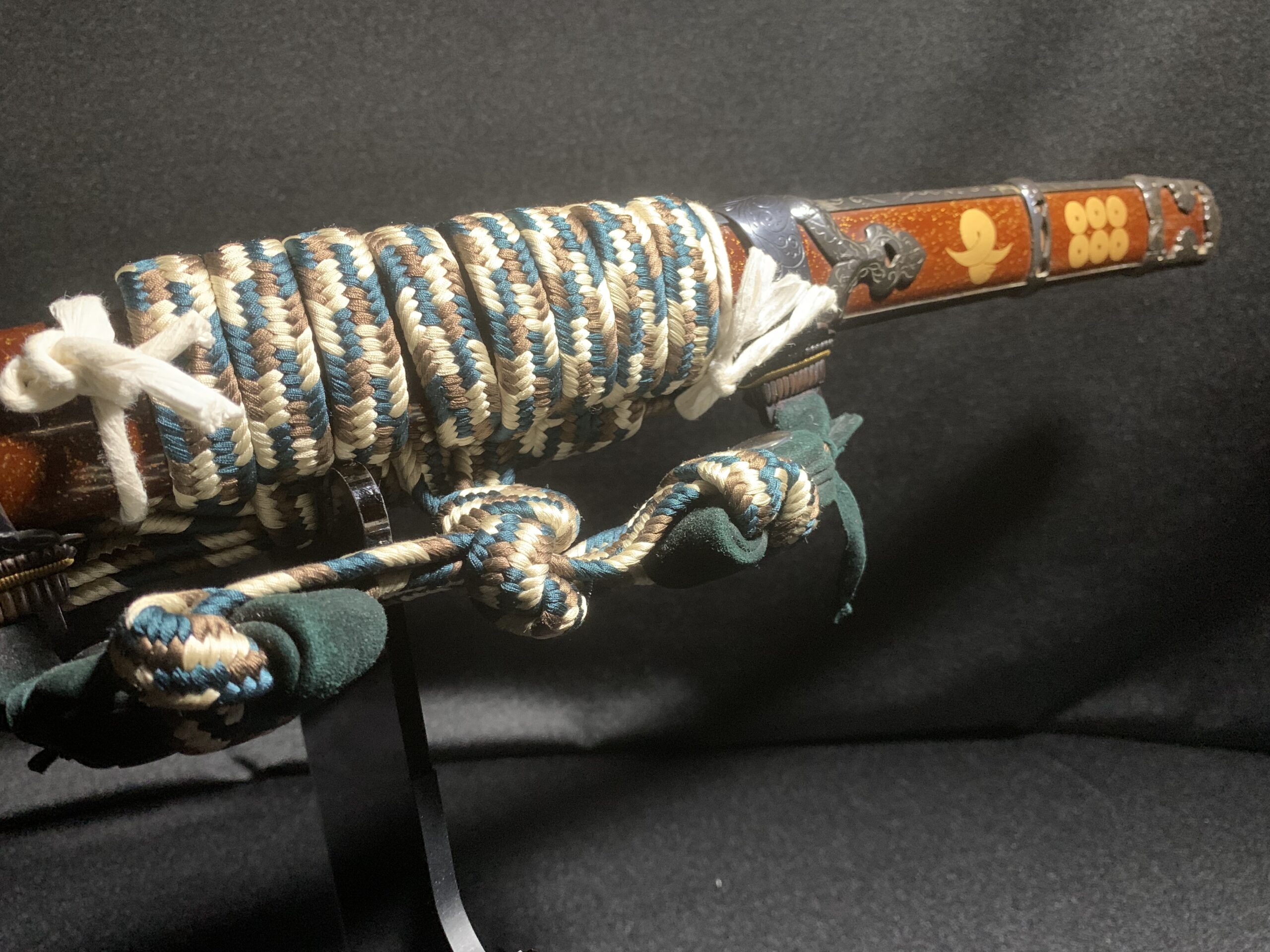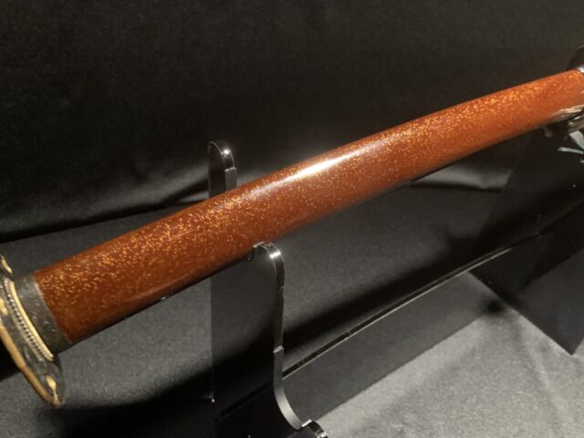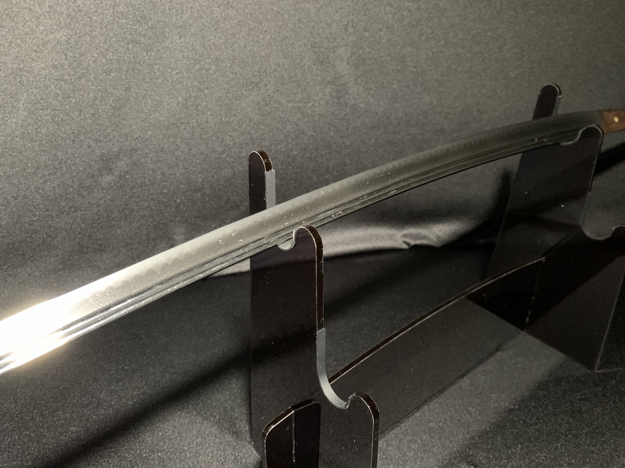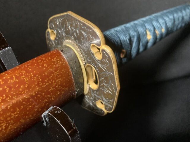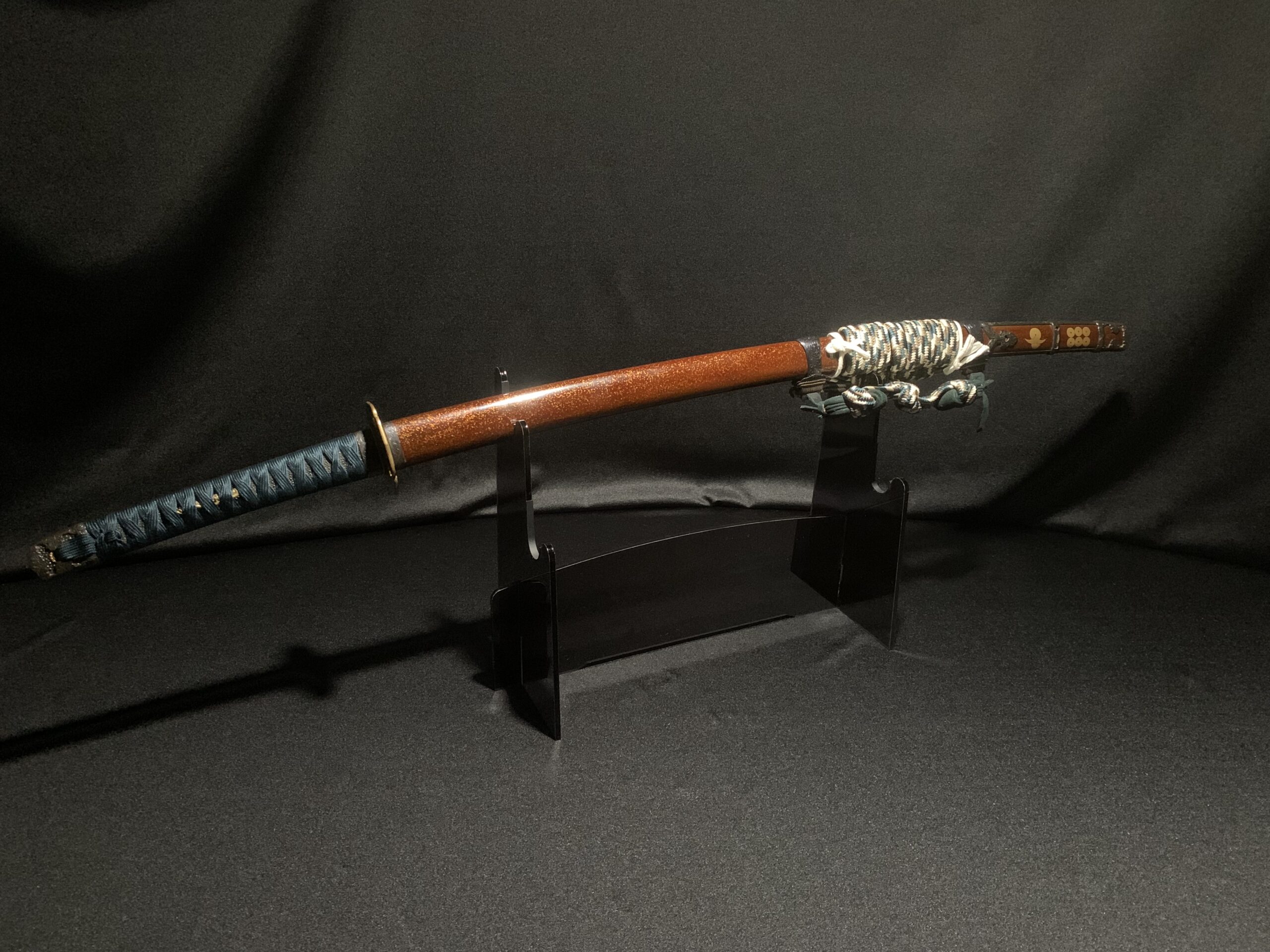 Kanesaki(兼先)war ein hoch angesehener Schwertschmied, dessen Ruf ihm Erfolg in verschiedenen Regionen einbrachte. Dieses Stück besitzt ein außergewöhnlich gut gearbeitetes Koshirae(拵え, die Schwertmontierung), das zusammen mit der Klinge ausgestellt eine elegante und verfeinerte Präsenz ausstrahlt.