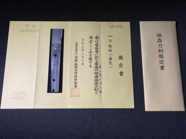 Dieses Katana wurde von der NBTHK(Nihon Bijutsu Token Hozon Kyokai), Japans renommiertester Schwertbewertungsorganisation, als Hozon Token(保存刀剣) zertifiziert.