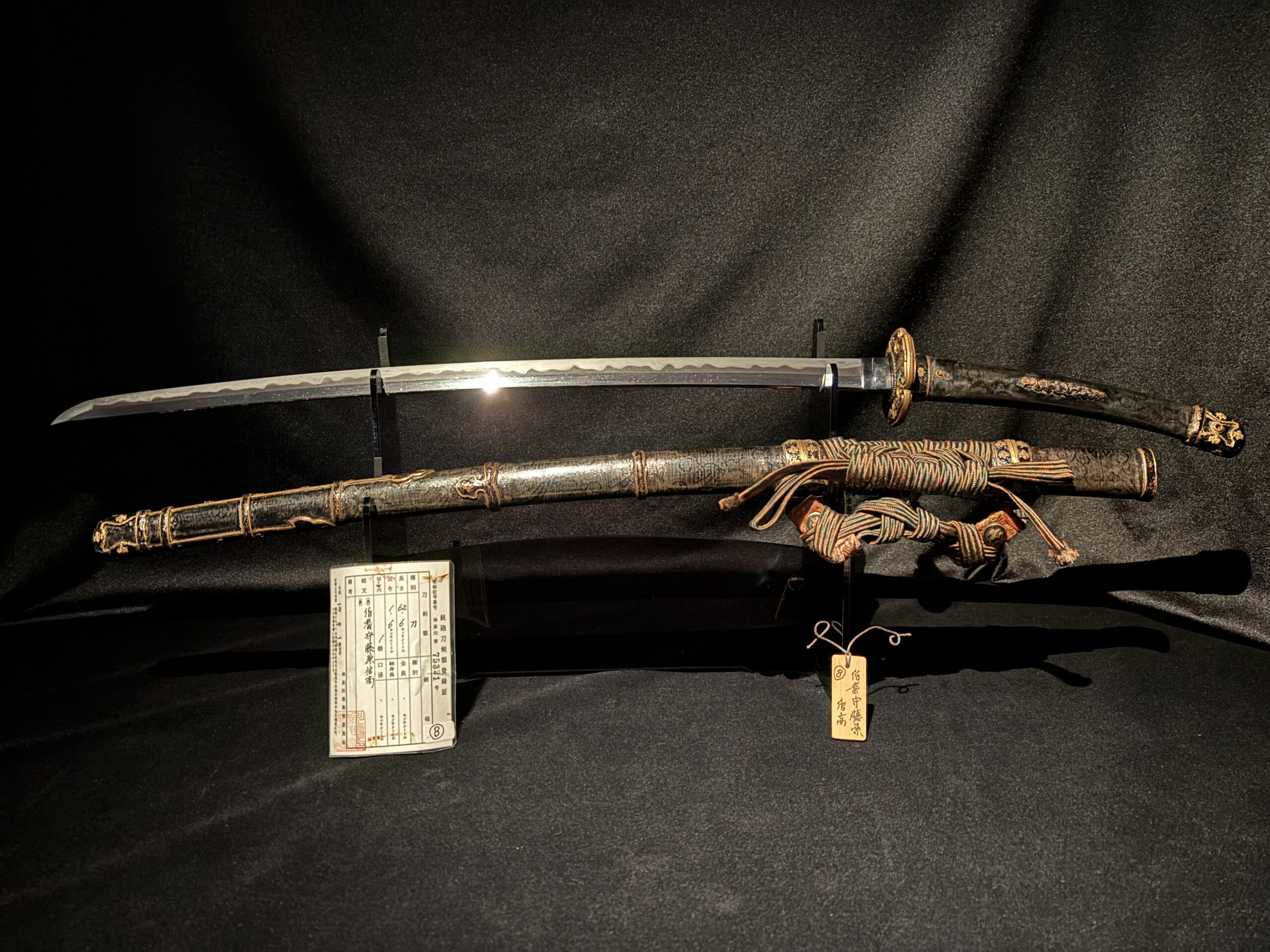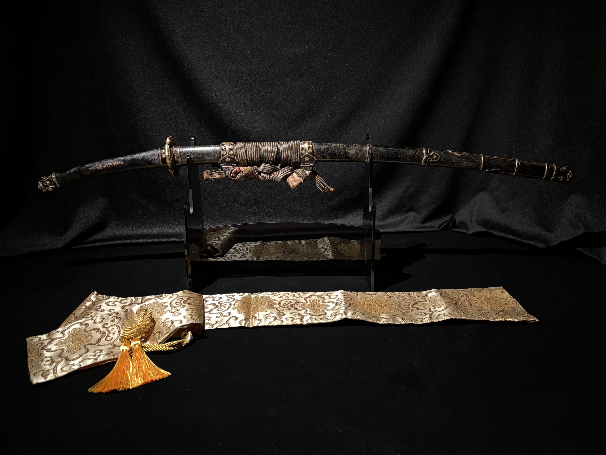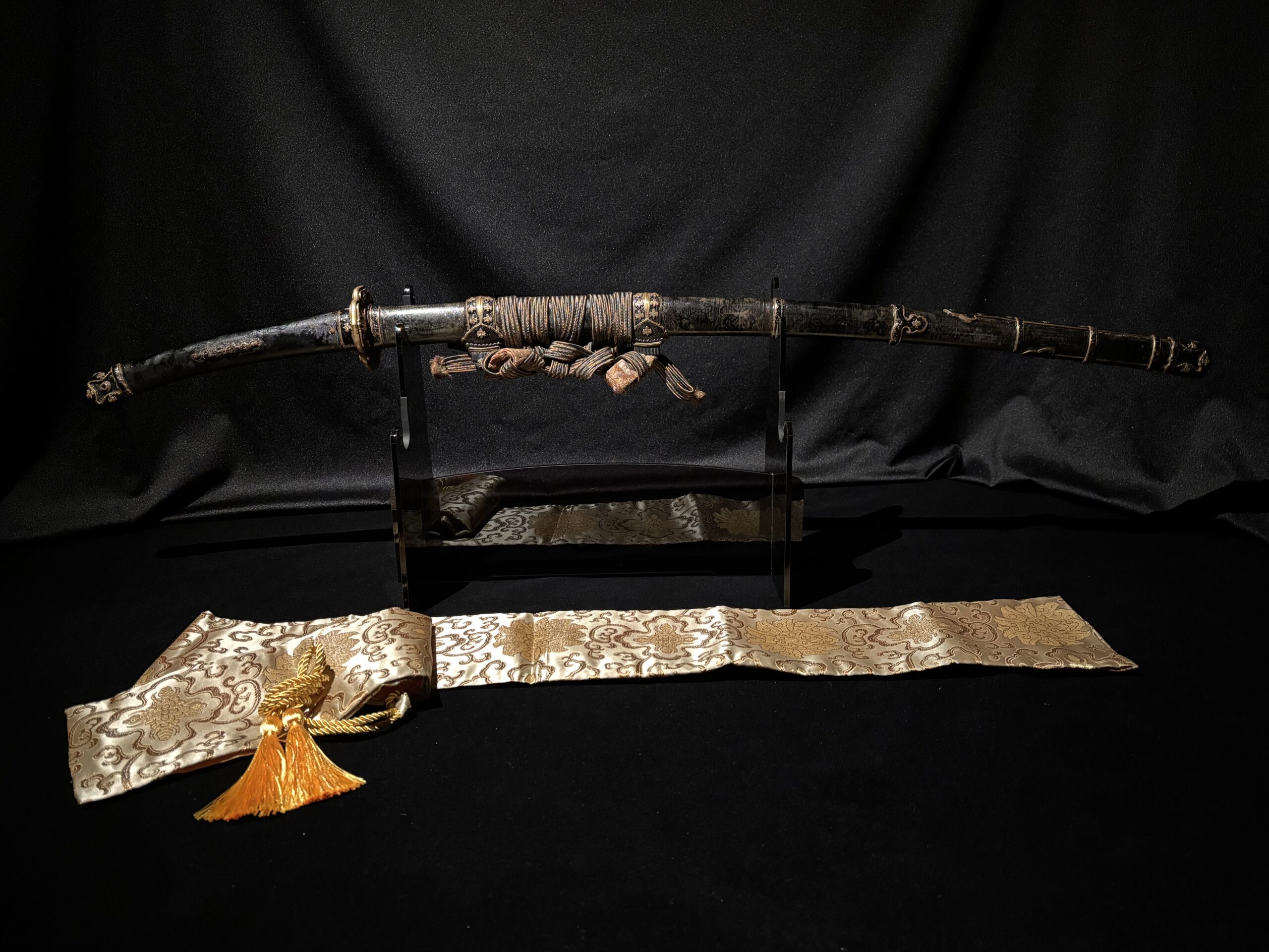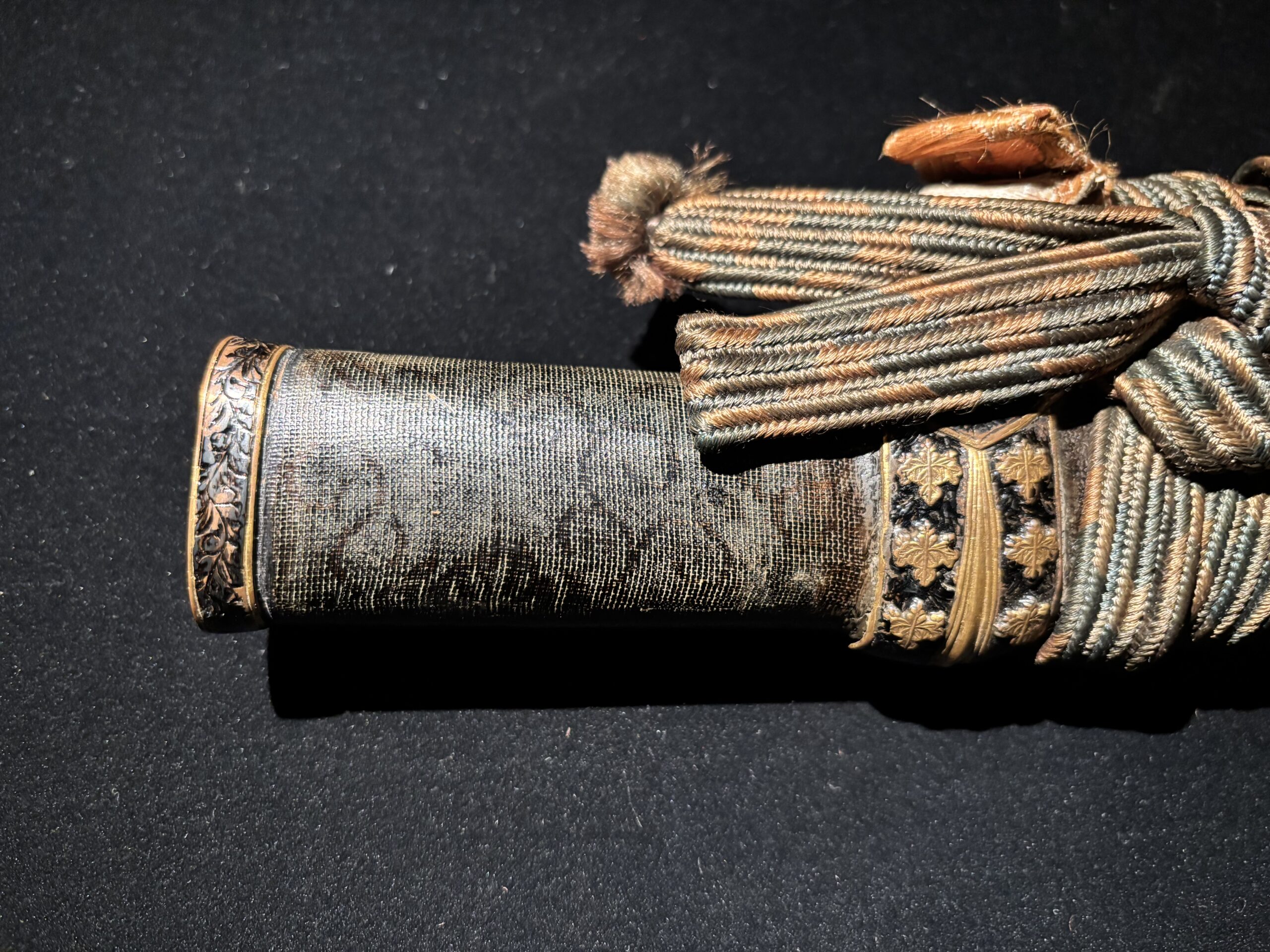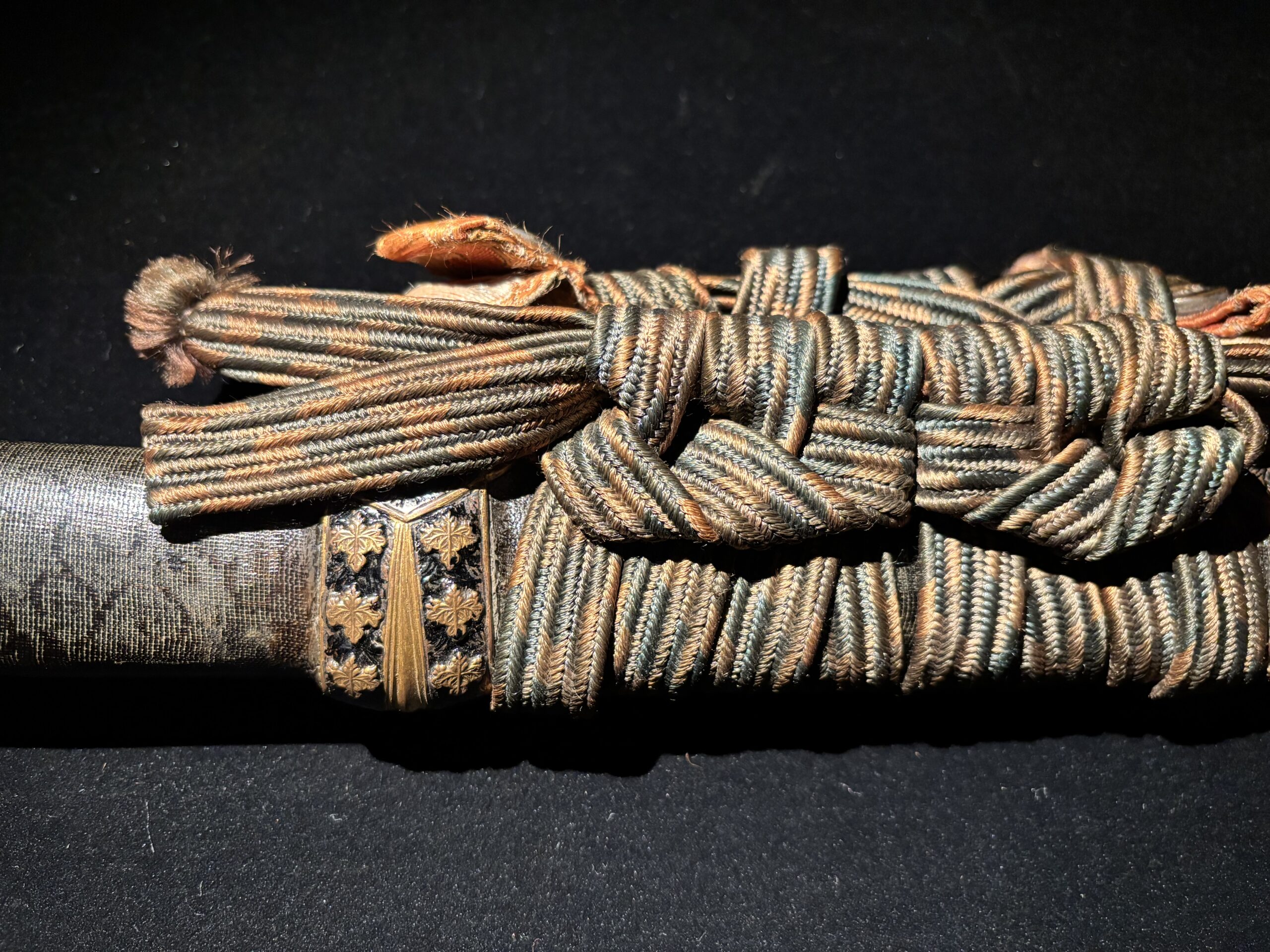 Neben seiner kraftvollen Klinge verfügt das Stück über ein unverwechselbares Koshirae(拵え, Schwertmontierung)mit einem verfeinerten, gedämpften Design, das ein starkes Gefühl für Geschichte vermittelt.