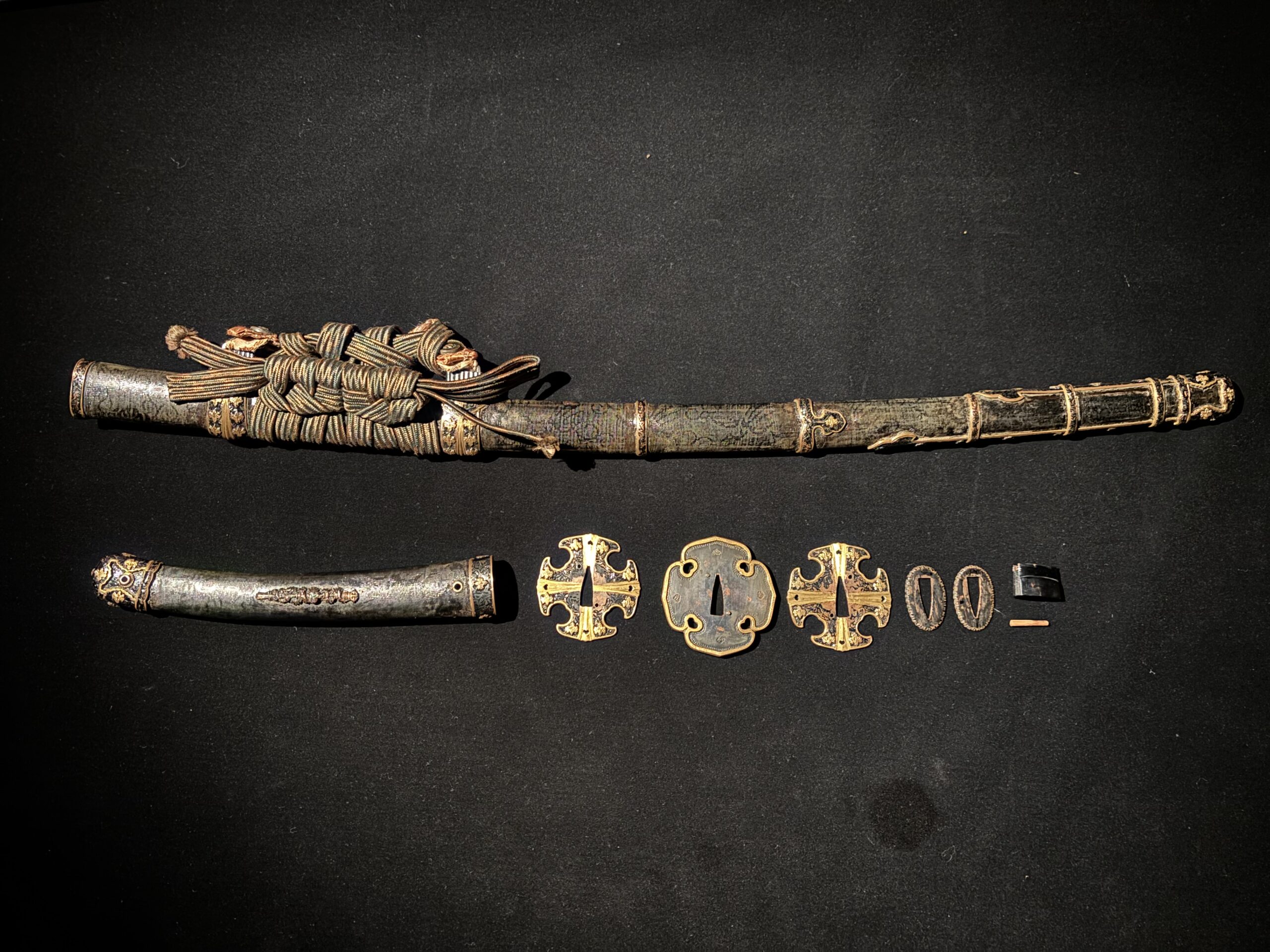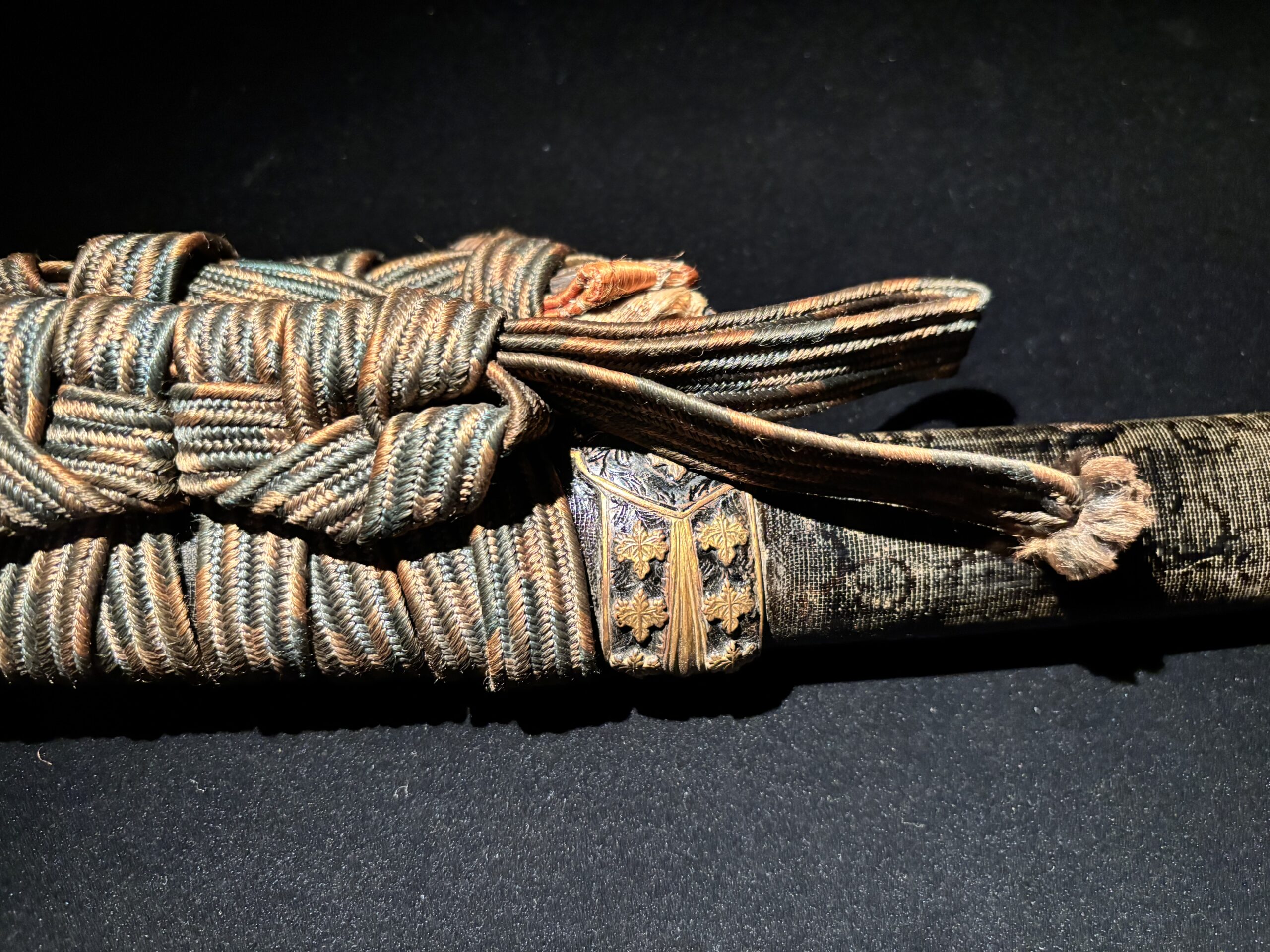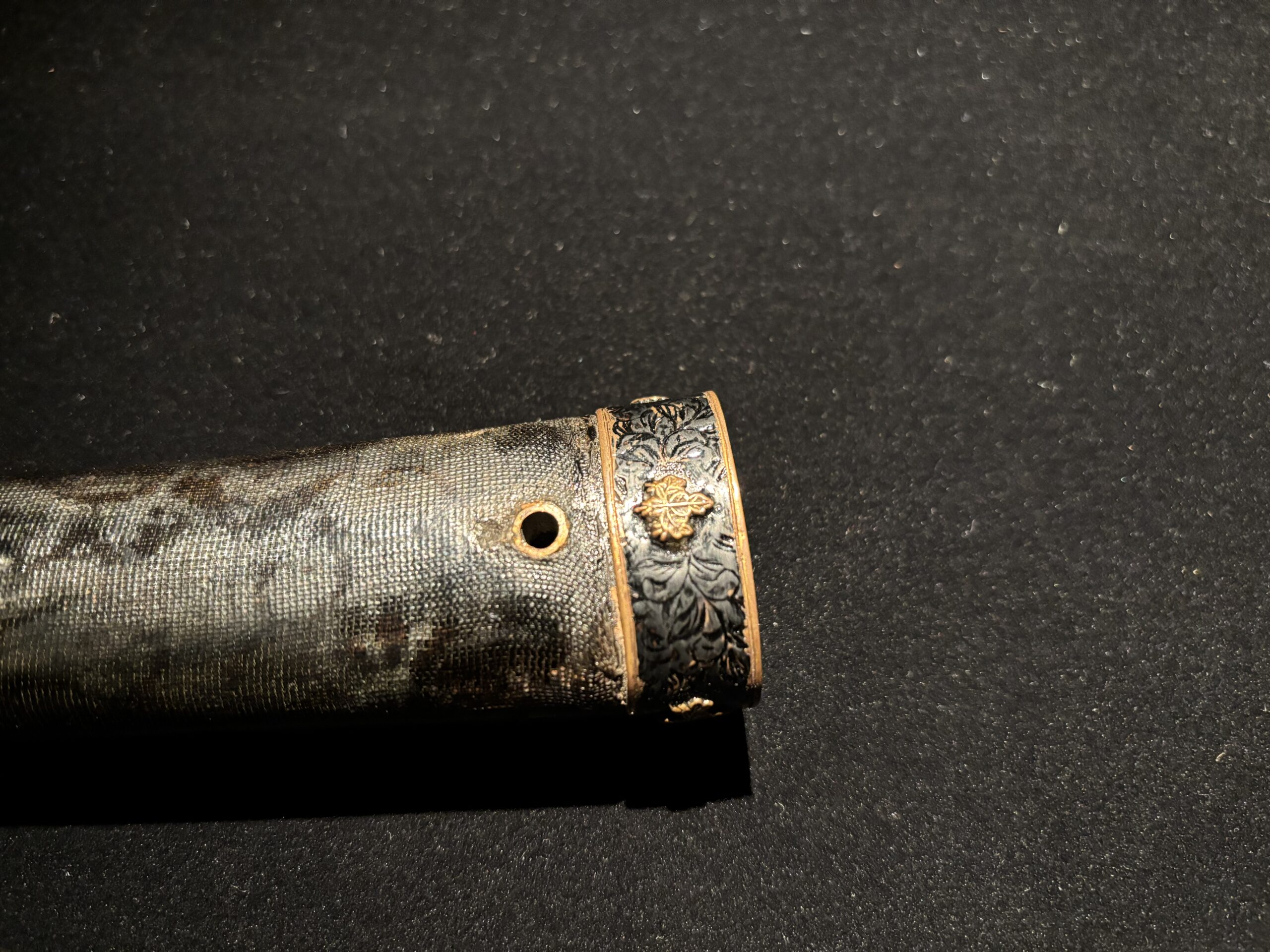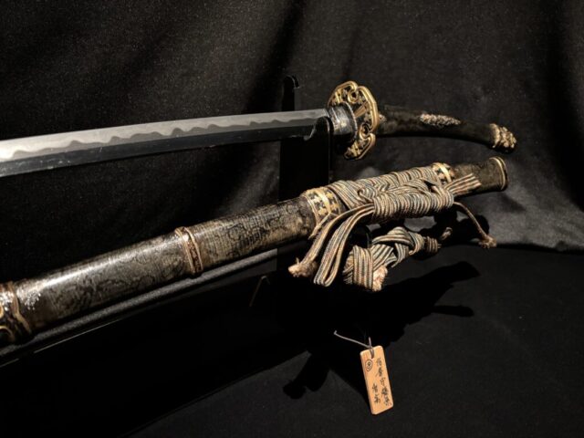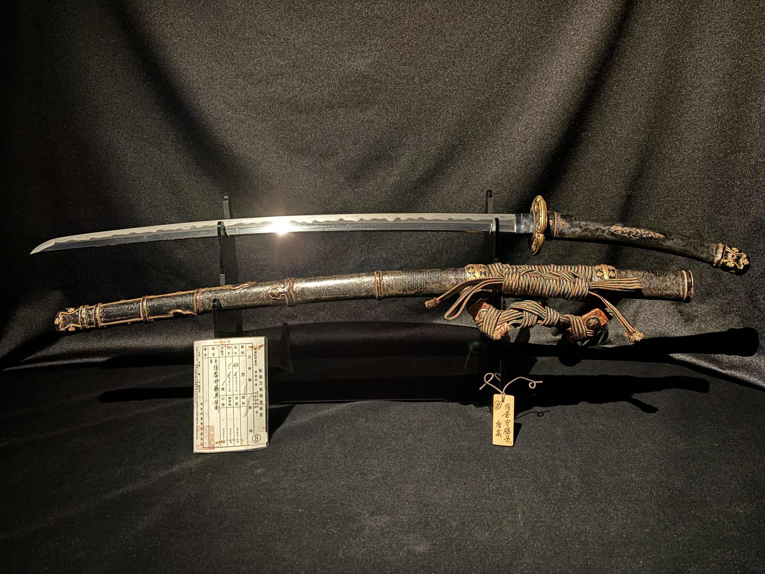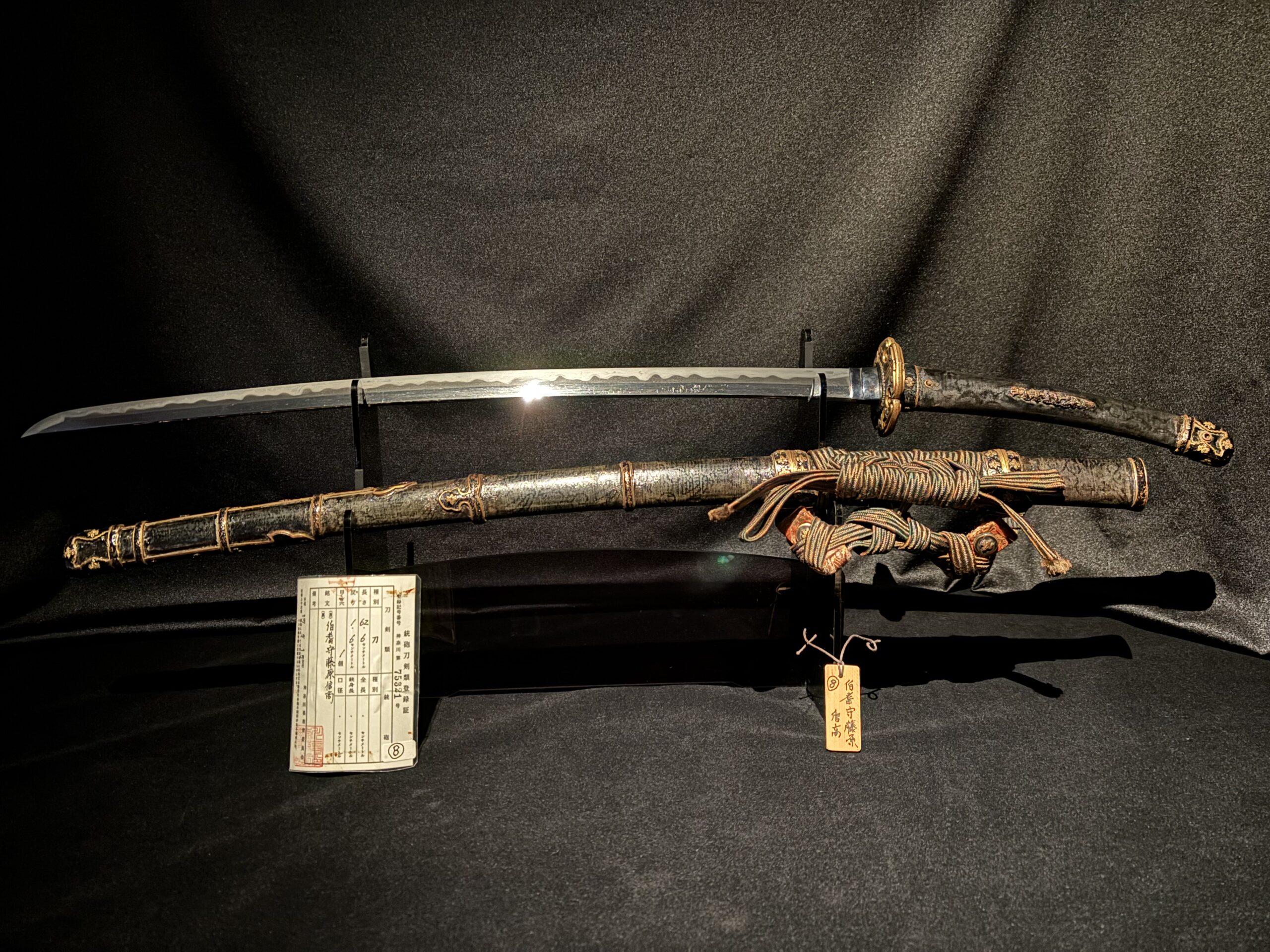 Neben seiner kraftvollen Klinge verfügt das Stück über ein unverwechselbares Koshirae(拵え, Schwertmontierung)mit einem verfeinerten, gedämpften Design, das ein starkes Gefühl für Geschichte vermittelt.
