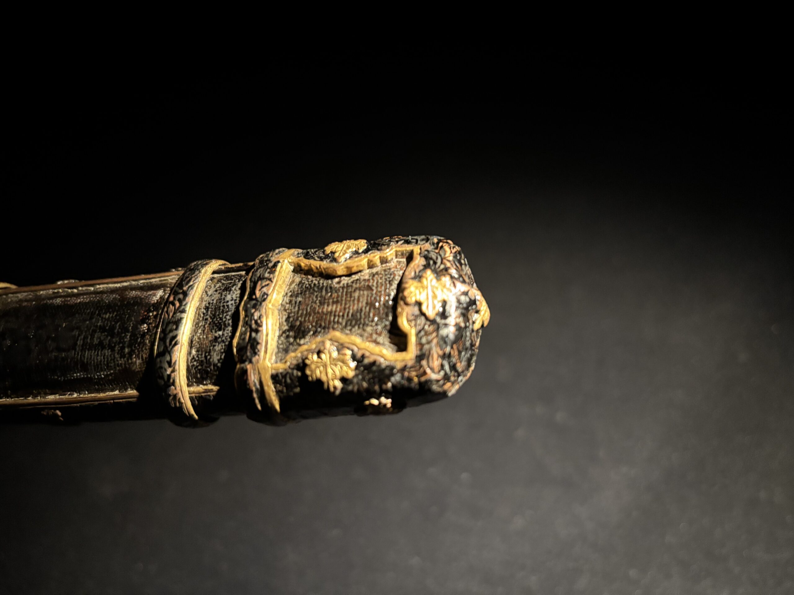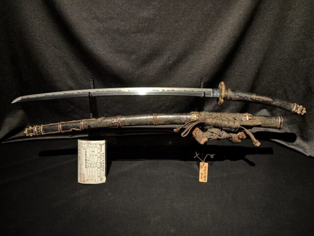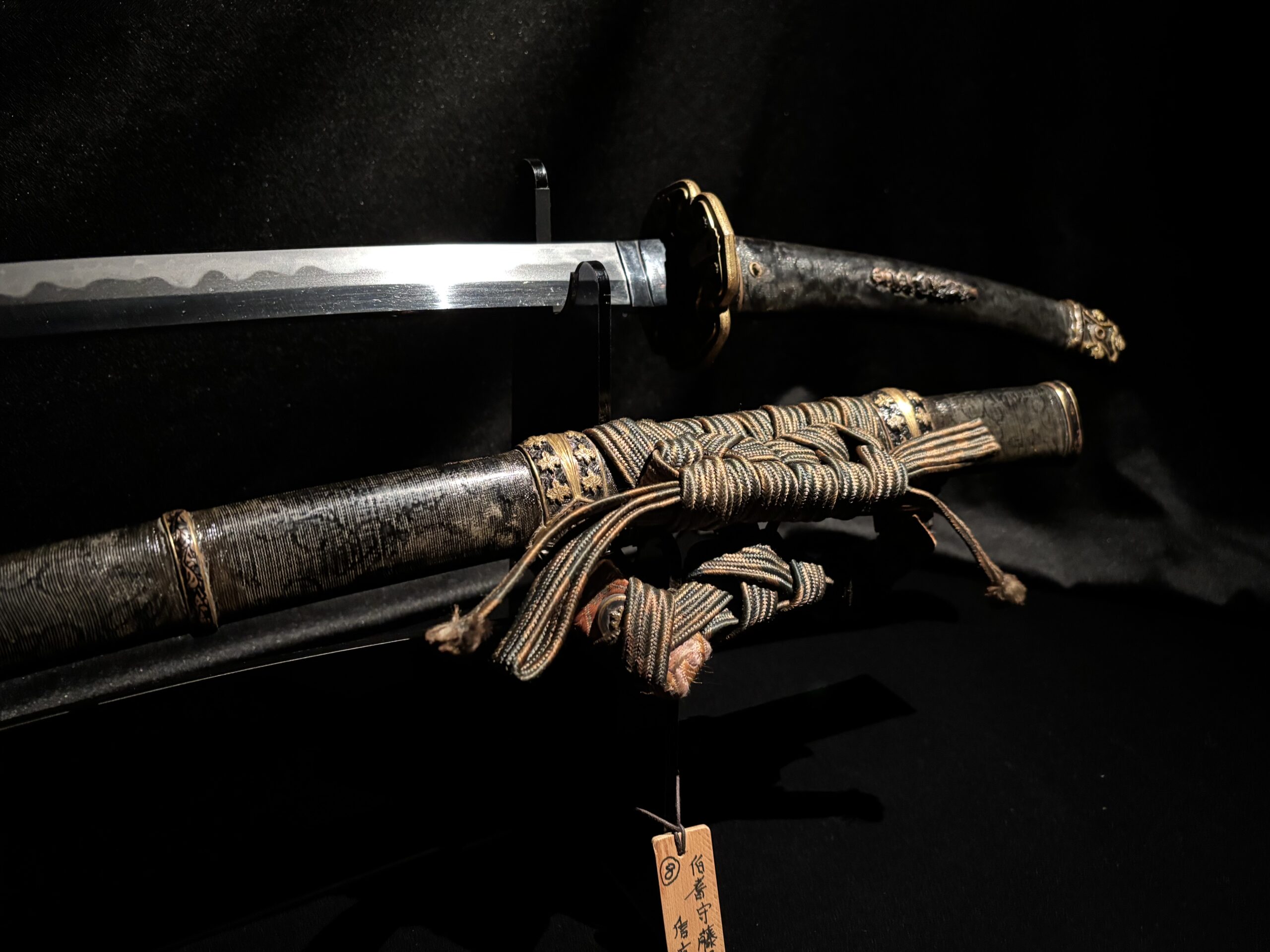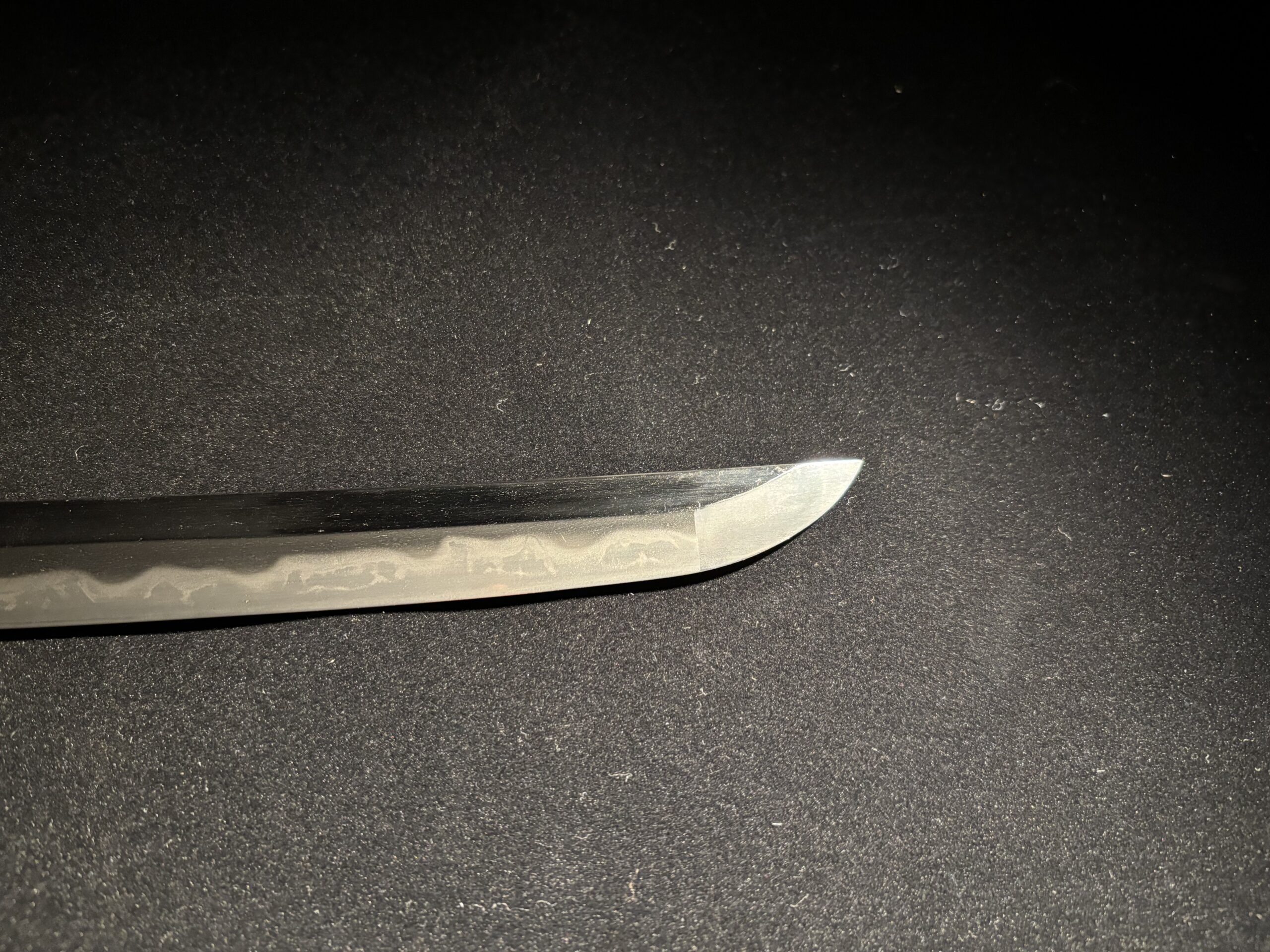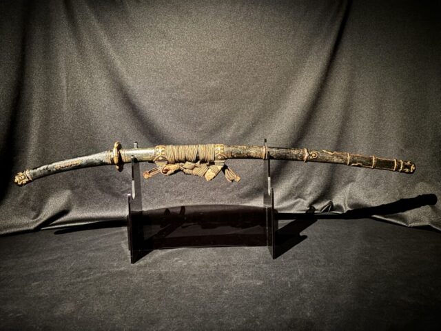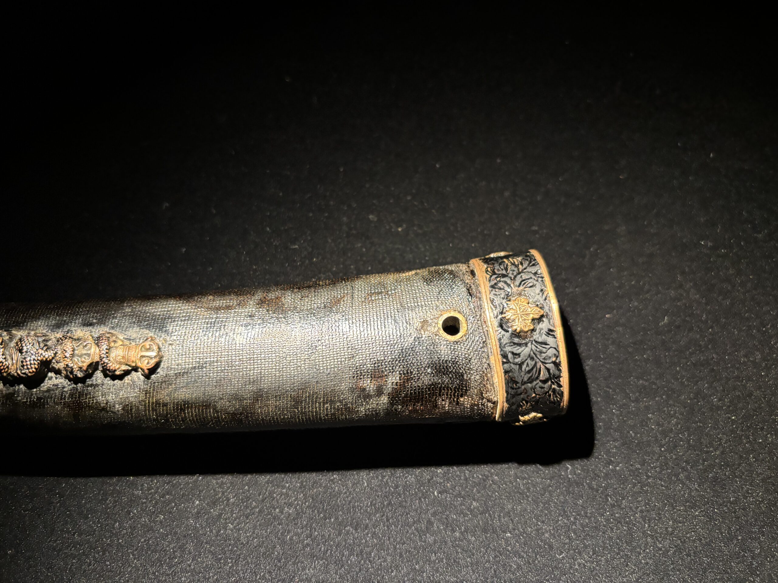 Neben seiner kraftvollen Klinge verfügt das Stück über ein unverwechselbares Koshirae(拵え, Schwertmontierung)mit einem verfeinerten, gedämpften Design, das ein starkes Gefühl für Geschichte vermittelt.