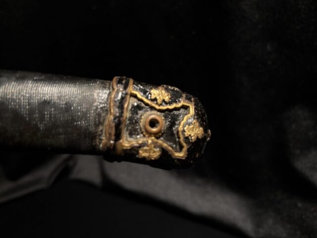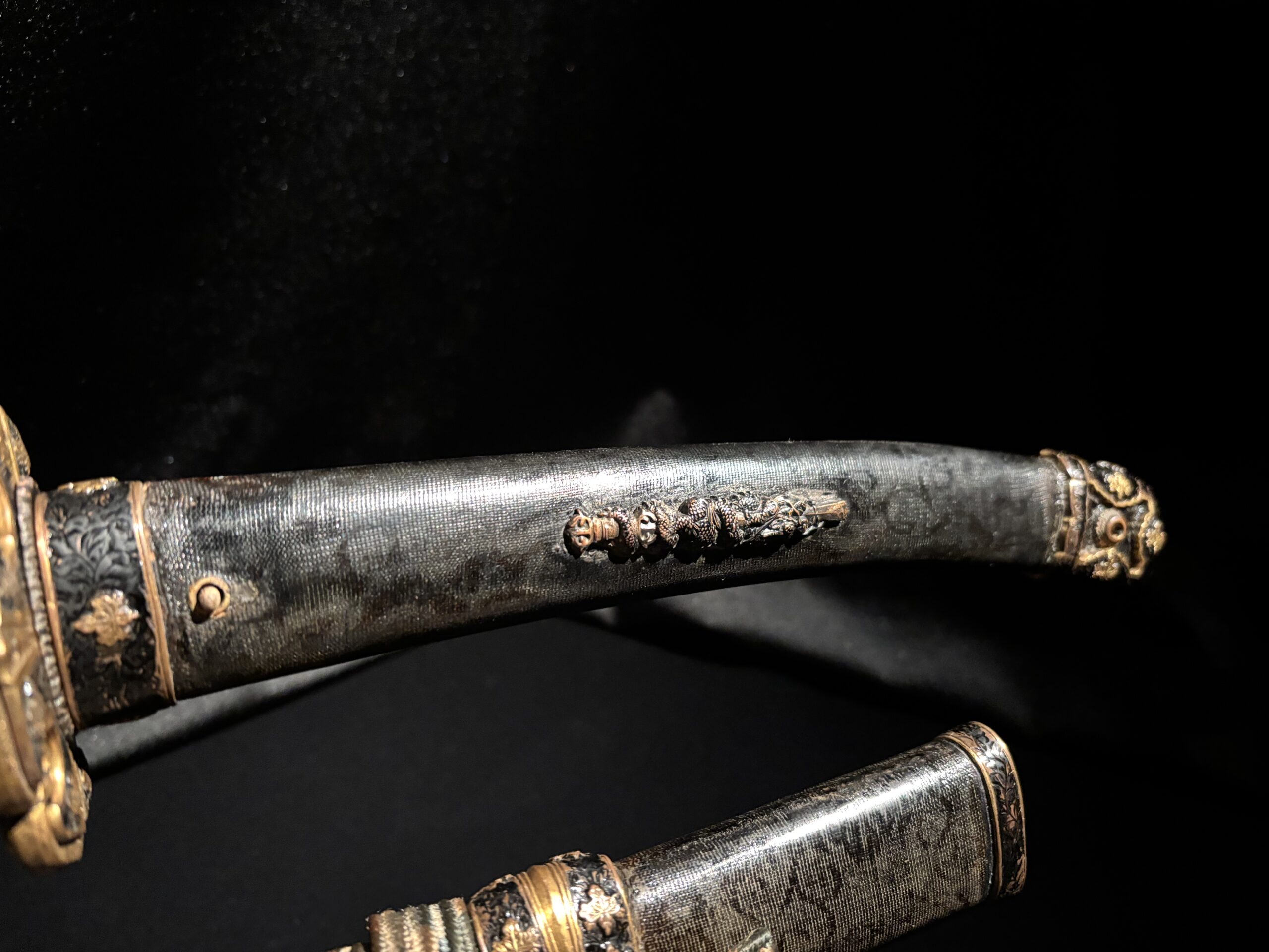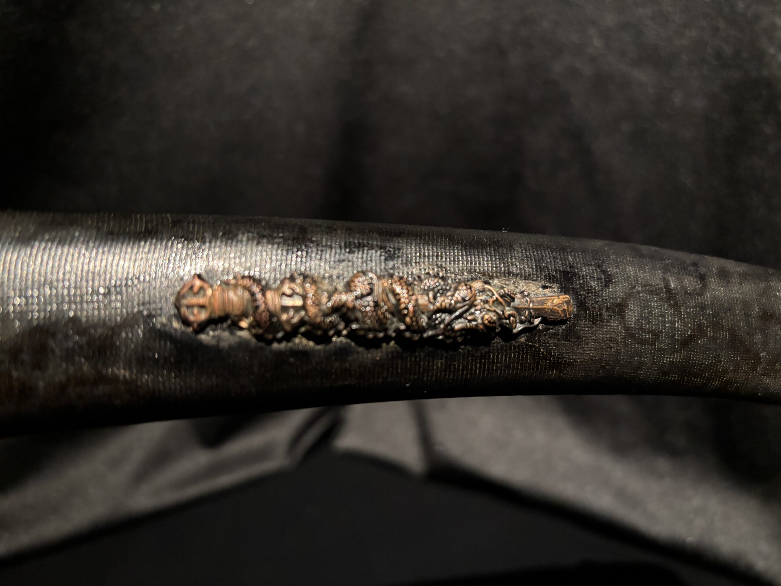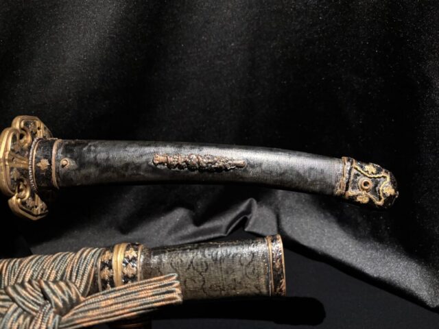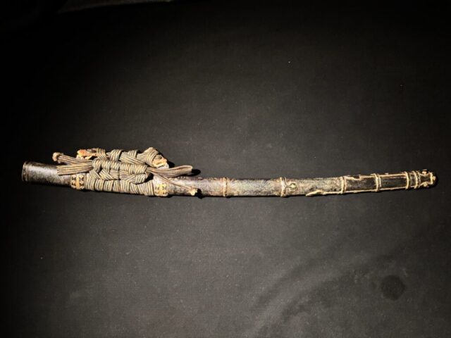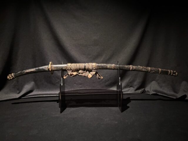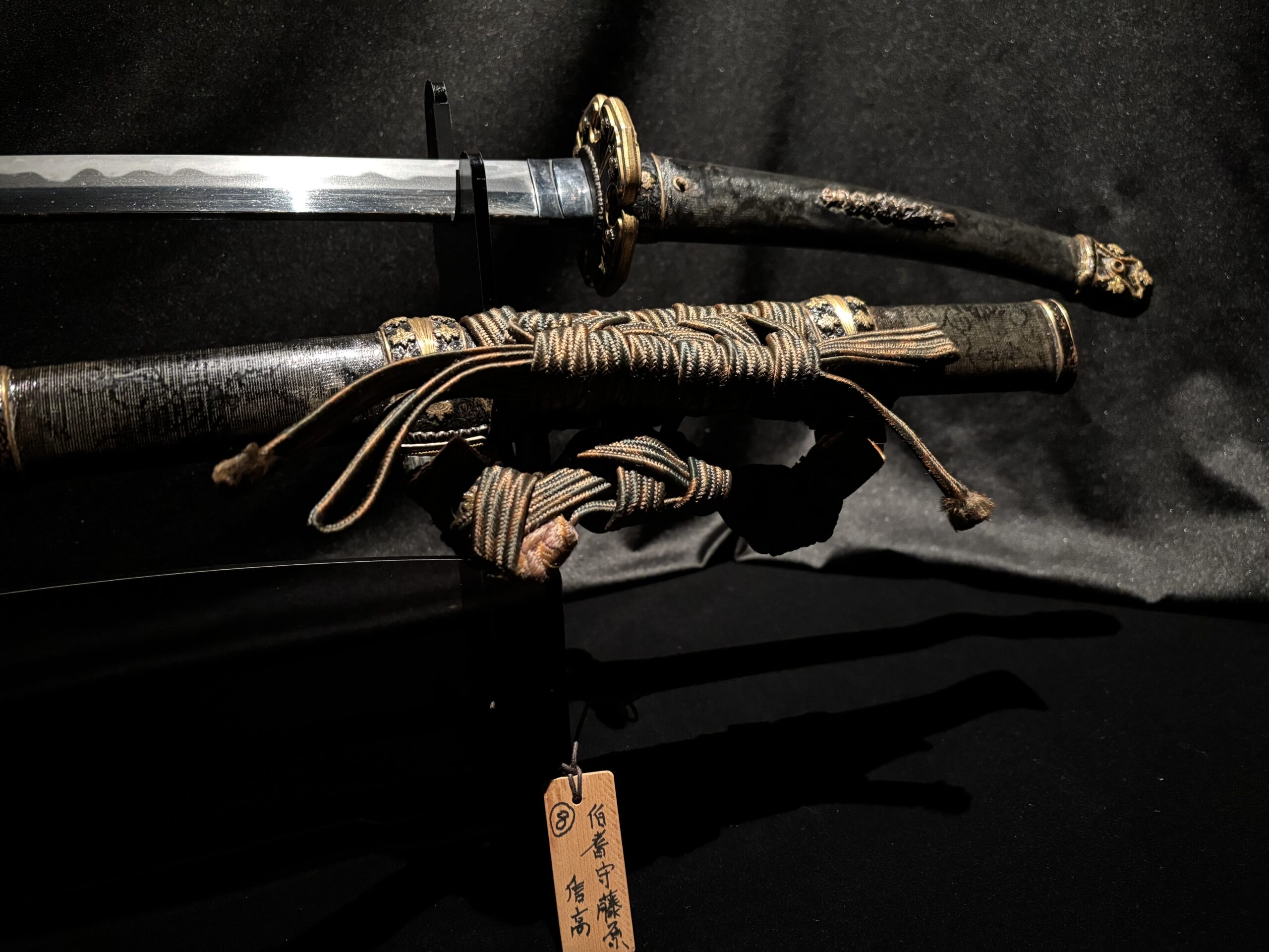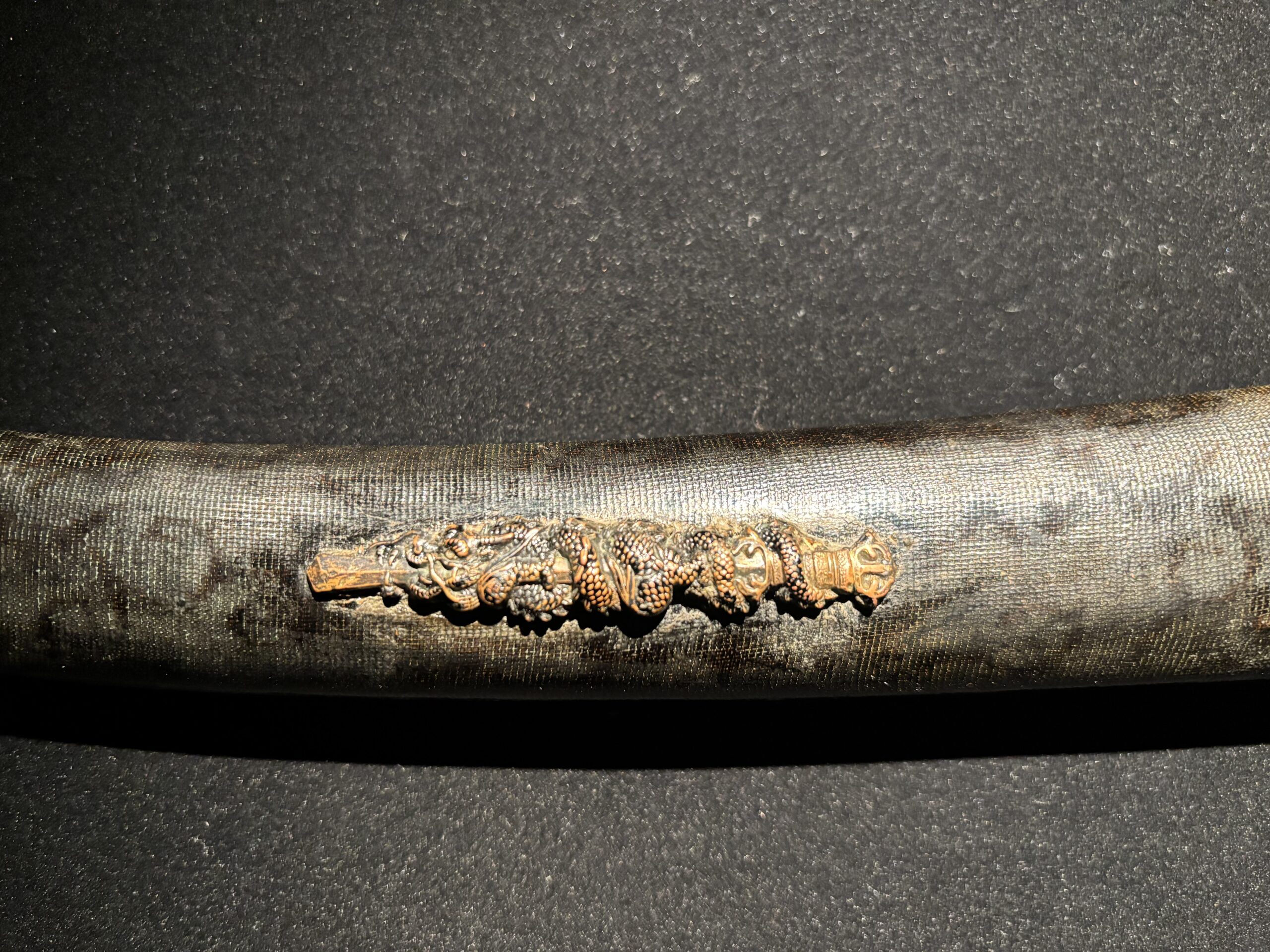 Neben seiner kraftvollen Klinge verfügt das Stück über ein unverwechselbares Koshirae(拵え, Schwertmontierung)mit einem verfeinerten, gedämpften Design, das ein starkes Gefühl für Geschichte vermittelt.