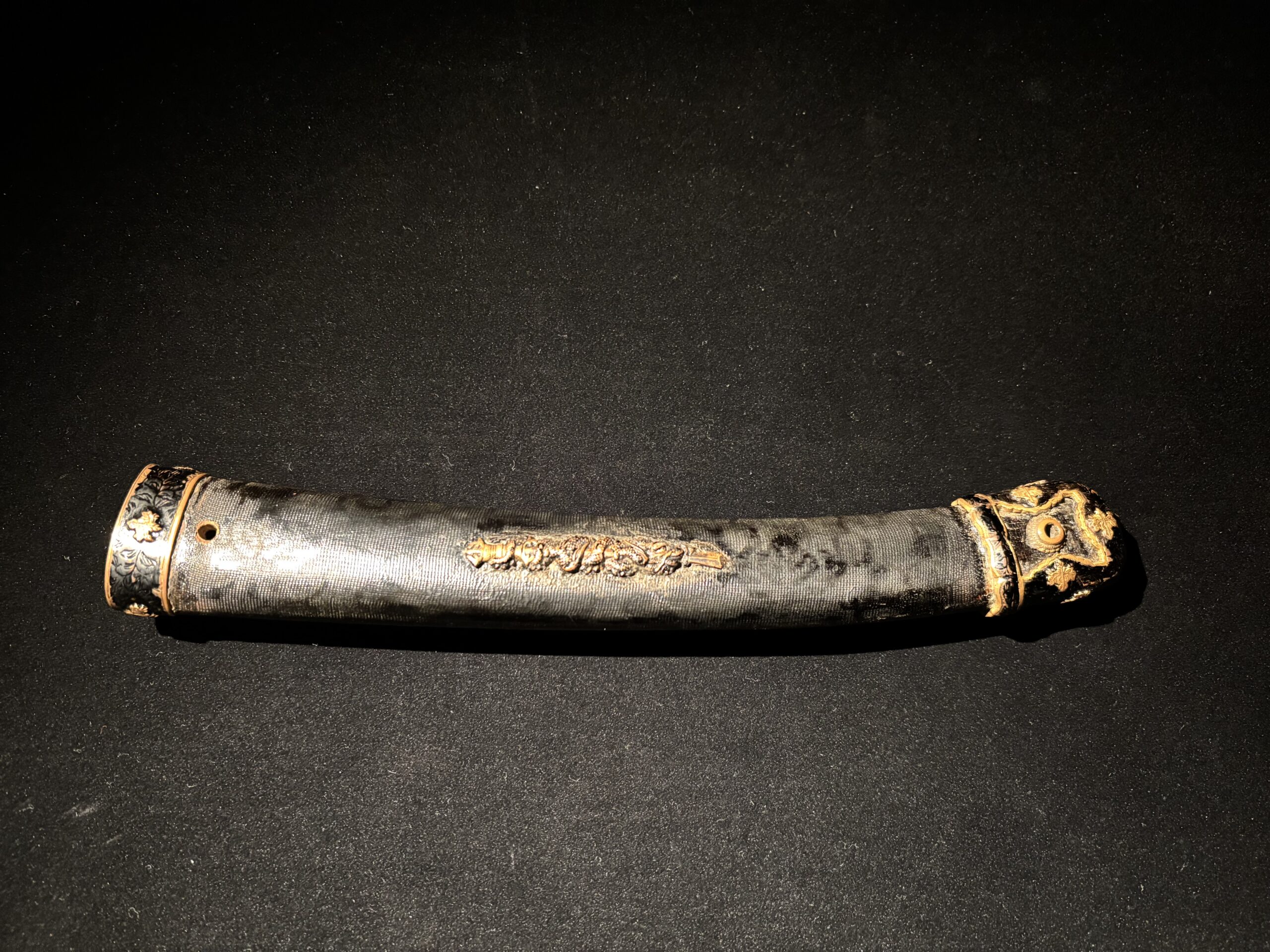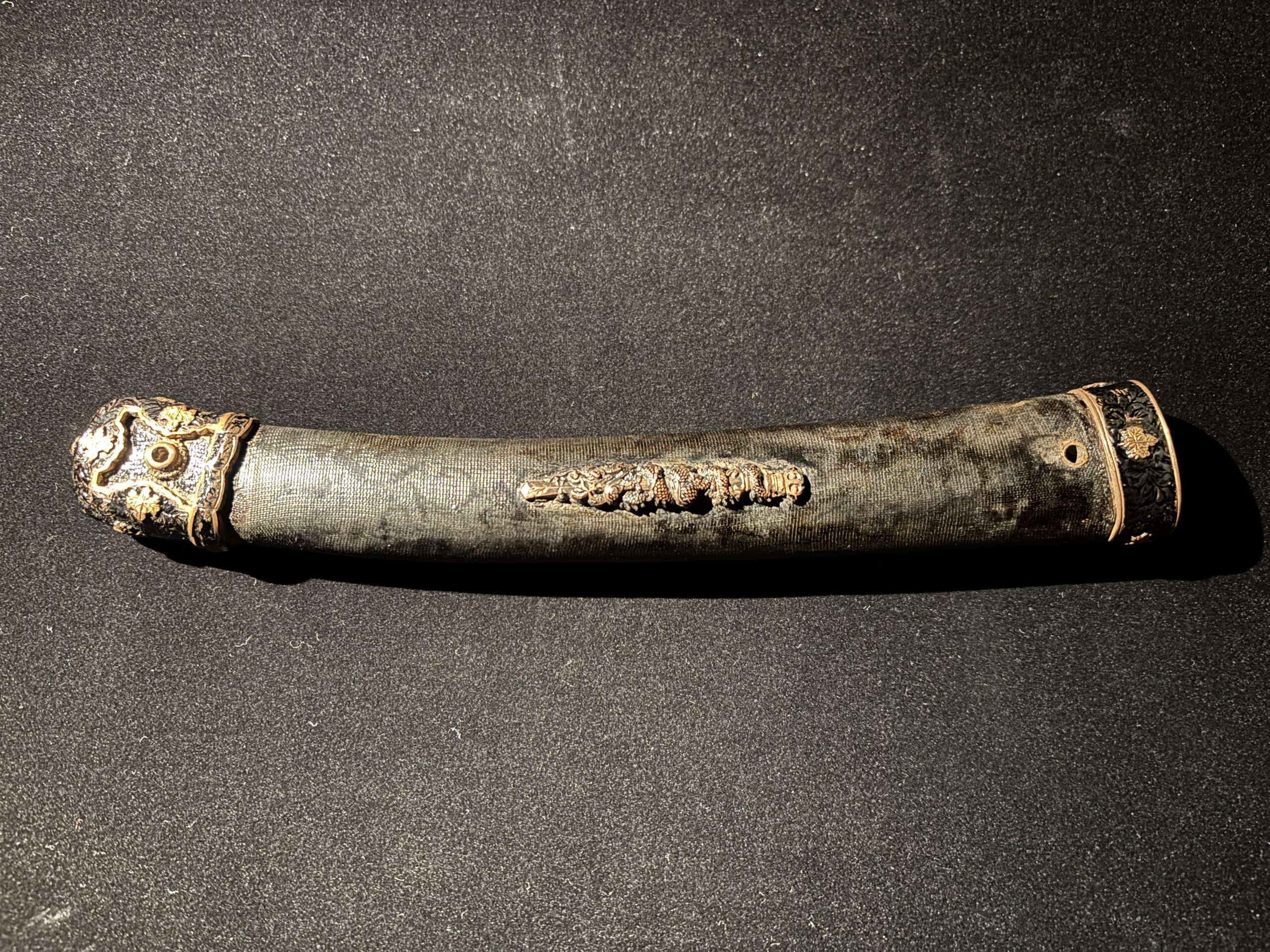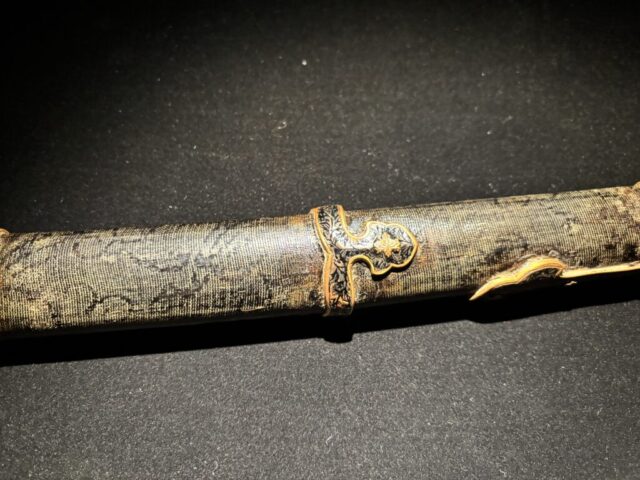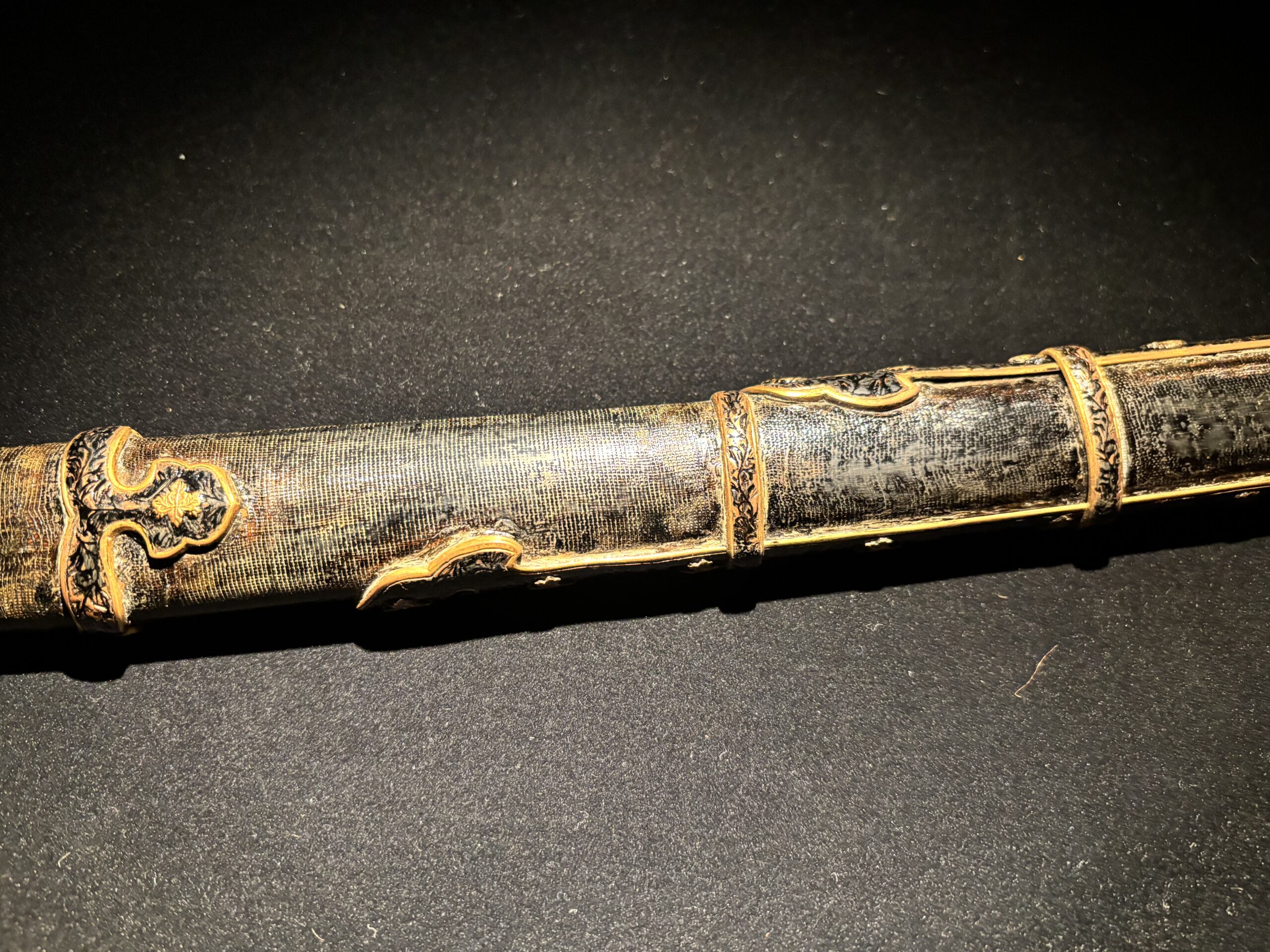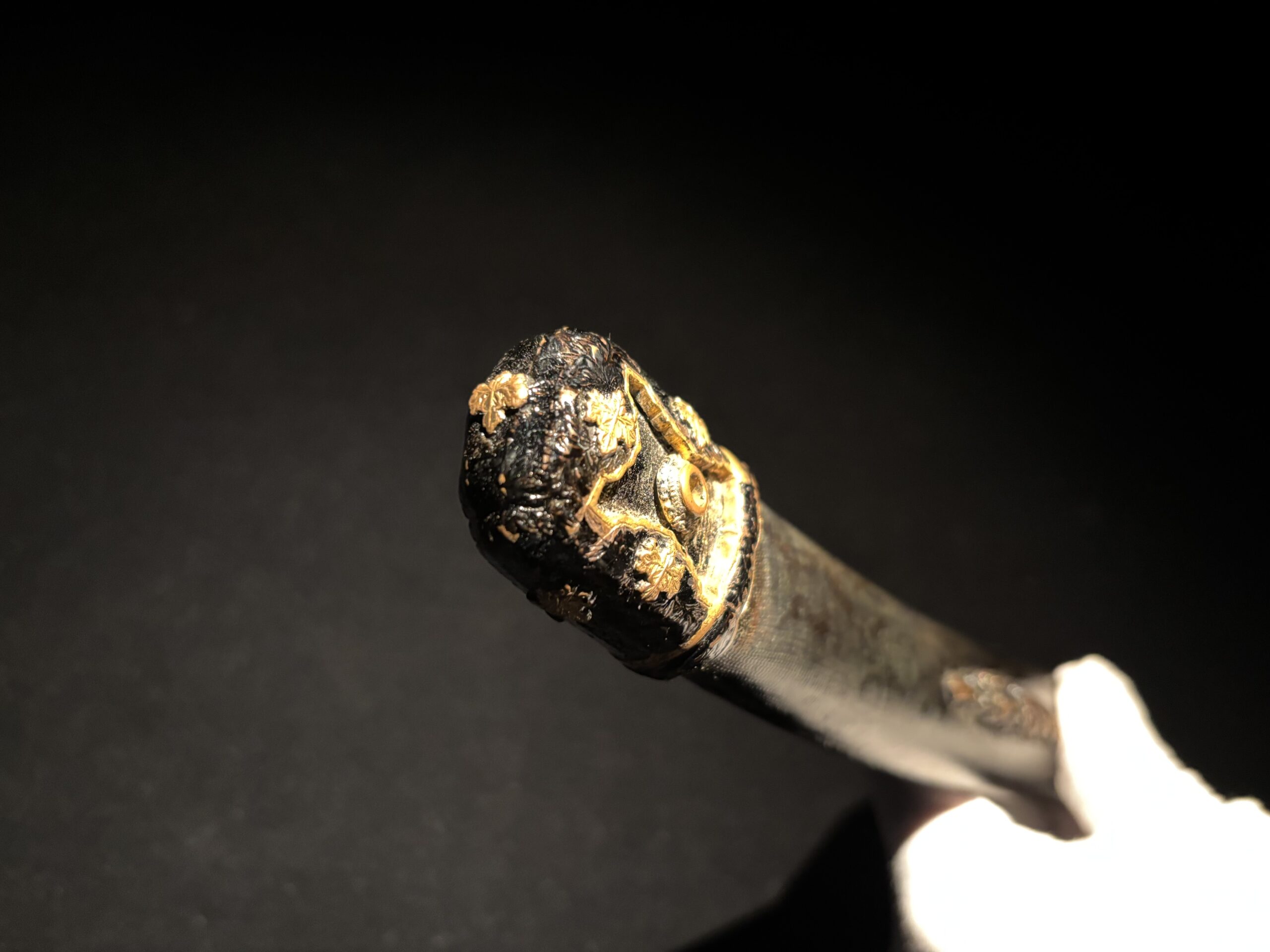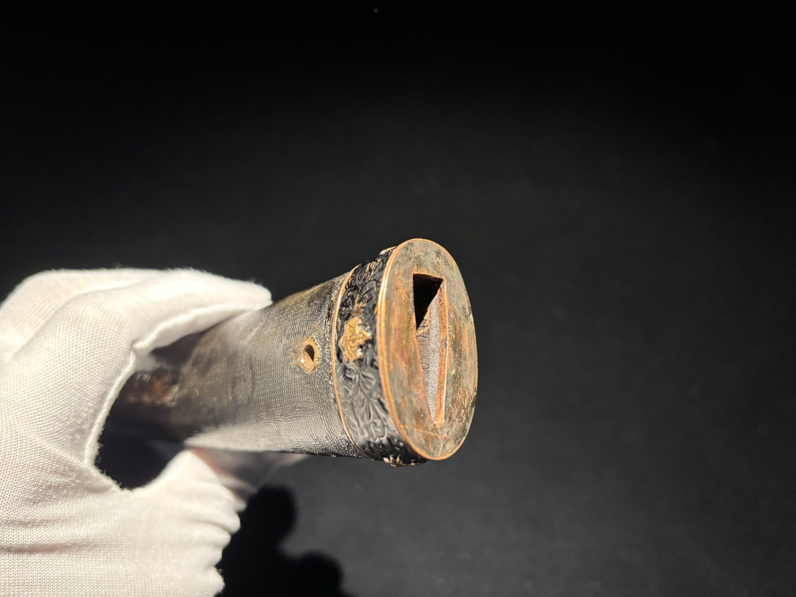 Neben seiner kraftvollen Klinge verfügt das Stück über ein unverwechselbares Koshirae(拵え, Schwertmontierung)mit einem verfeinerten, gedämpften Design, das ein starkes Gefühl für Geschichte vermittelt.