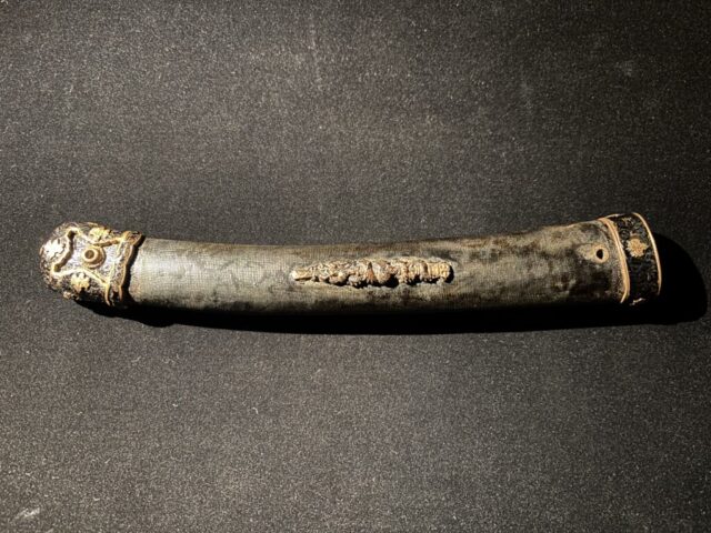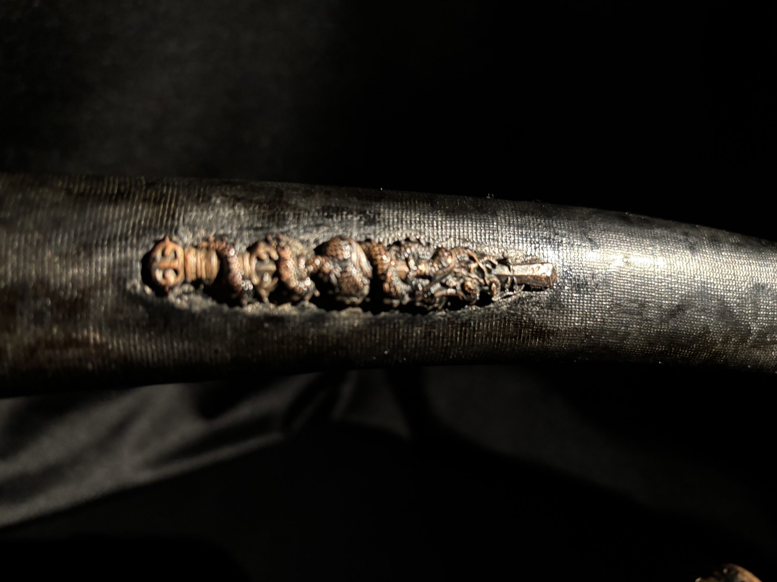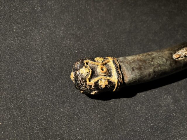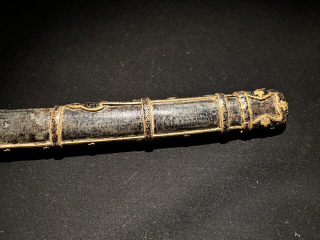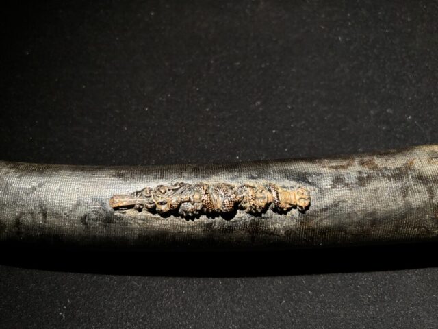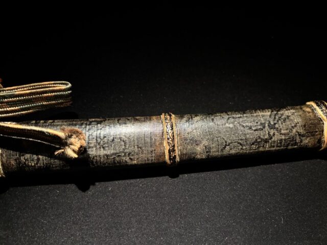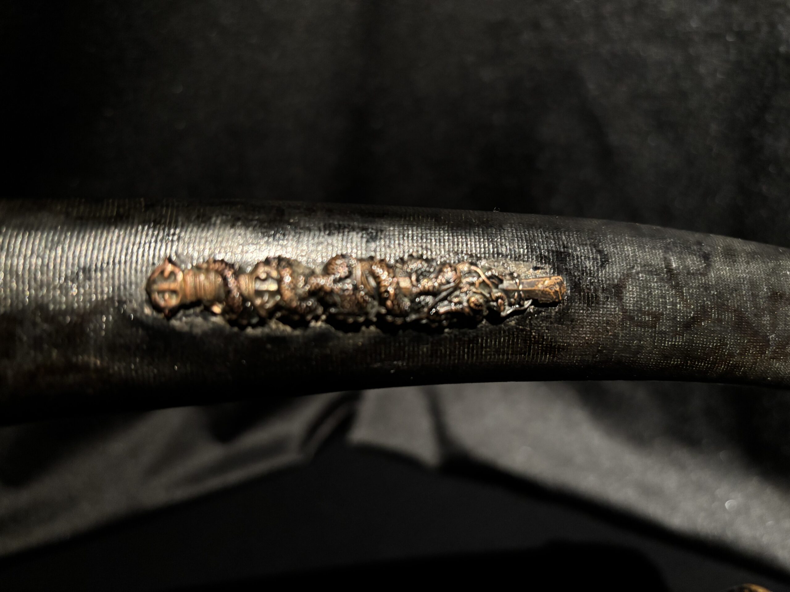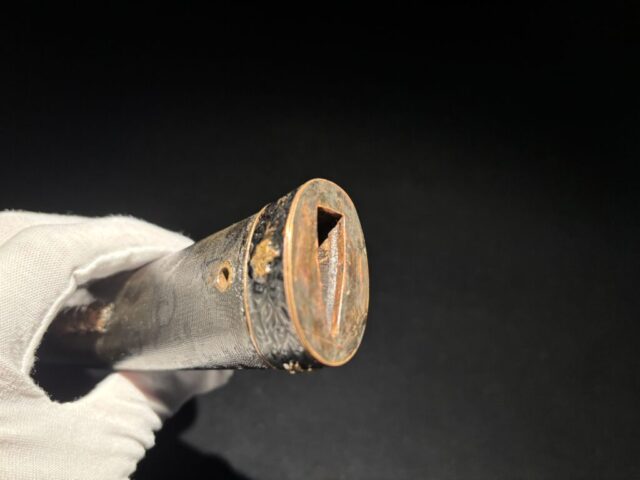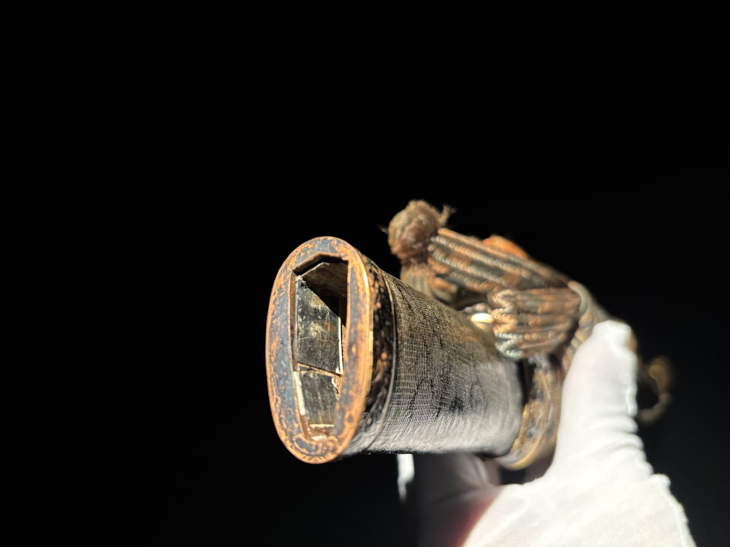Neben seiner kraftvollen Klinge verfügt das Stück über ein unverwechselbares Koshirae(拵え, Schwertmontierung)mit einem verfeinerten, gedämpften Design, das ein starkes Gefühl für Geschichte vermittelt.