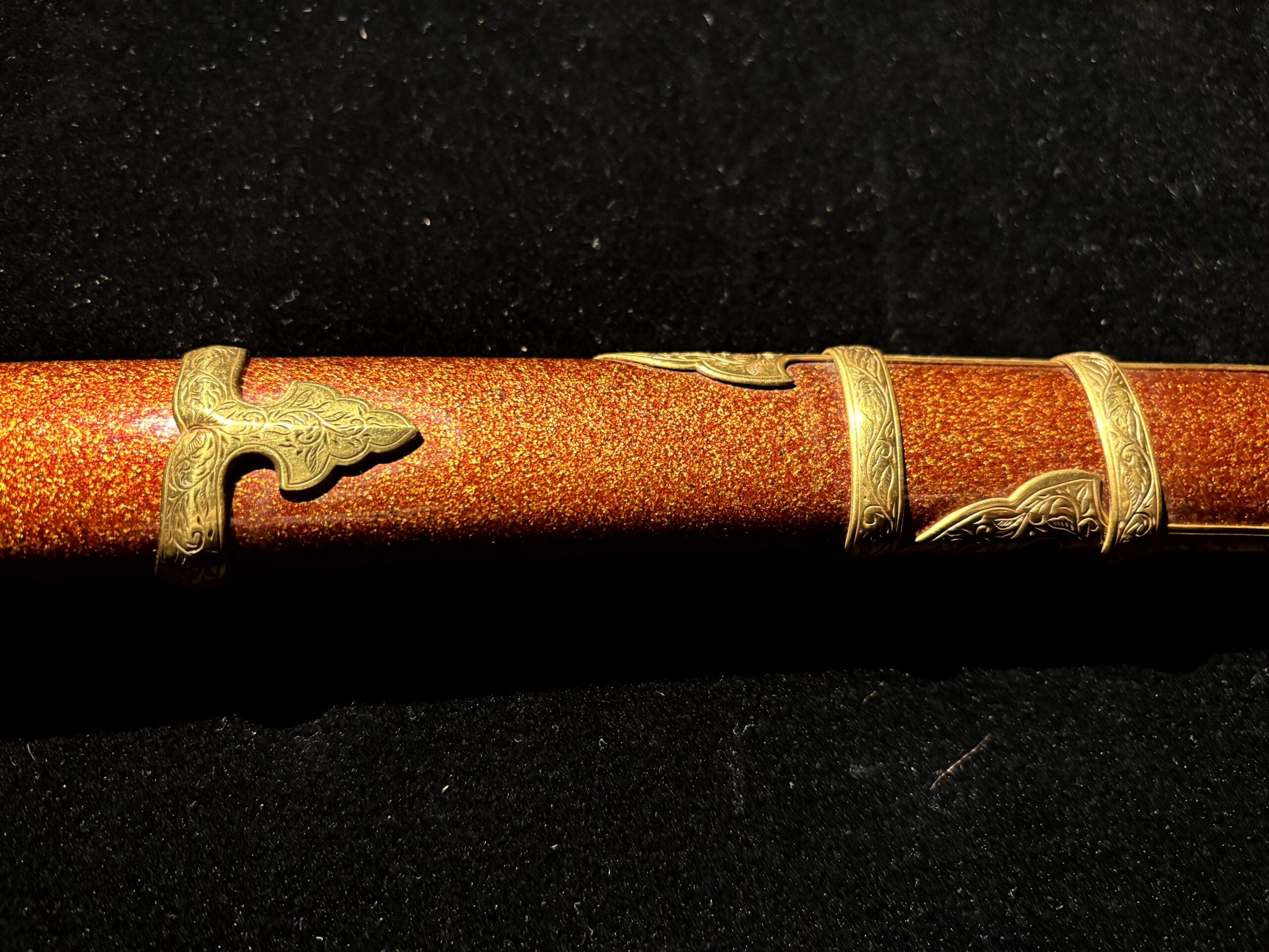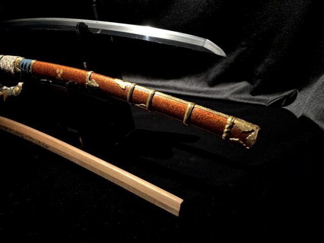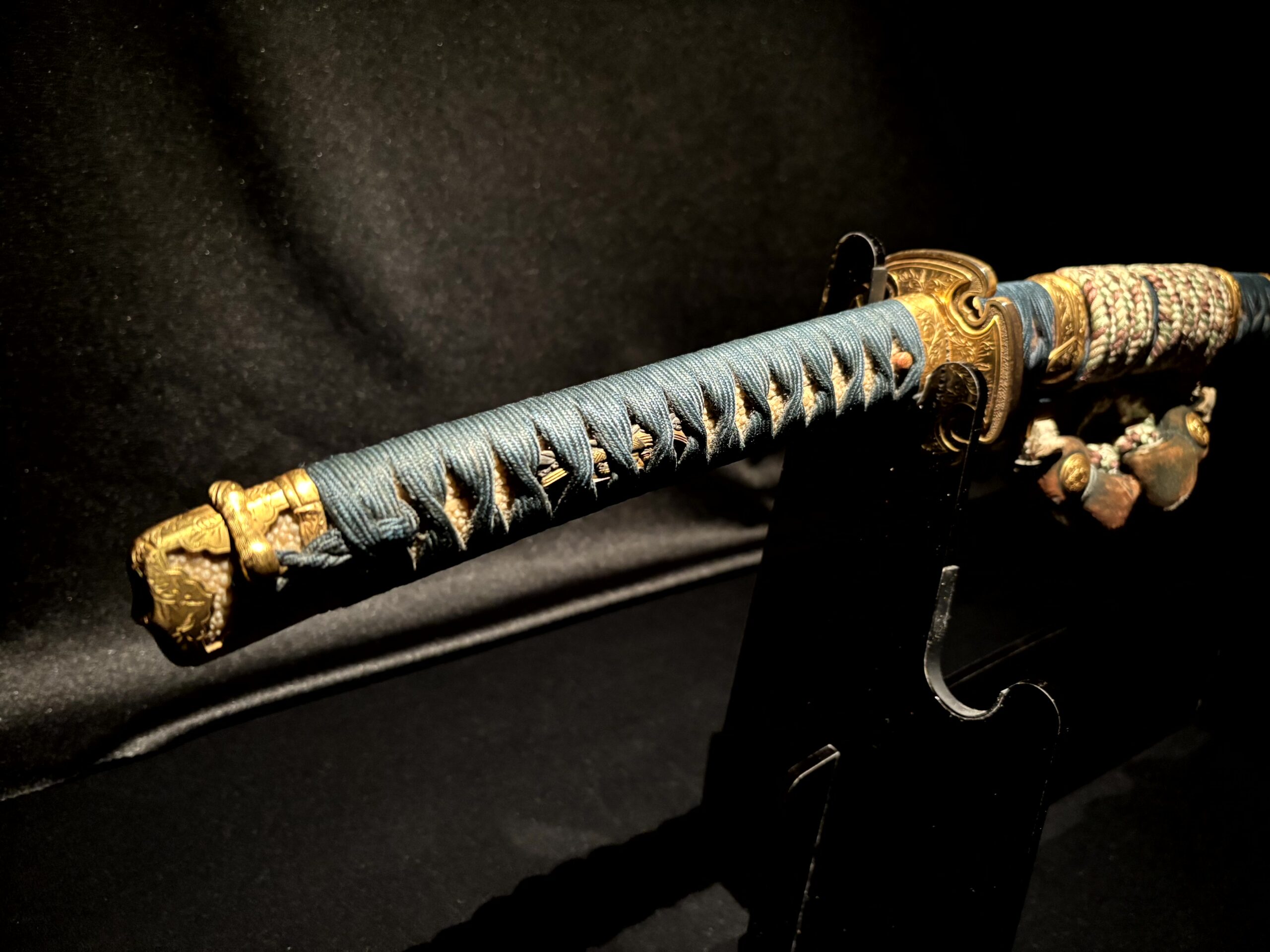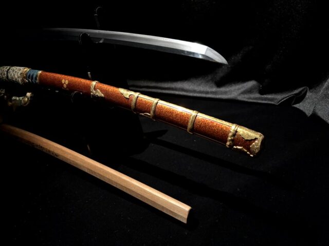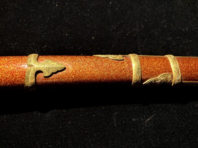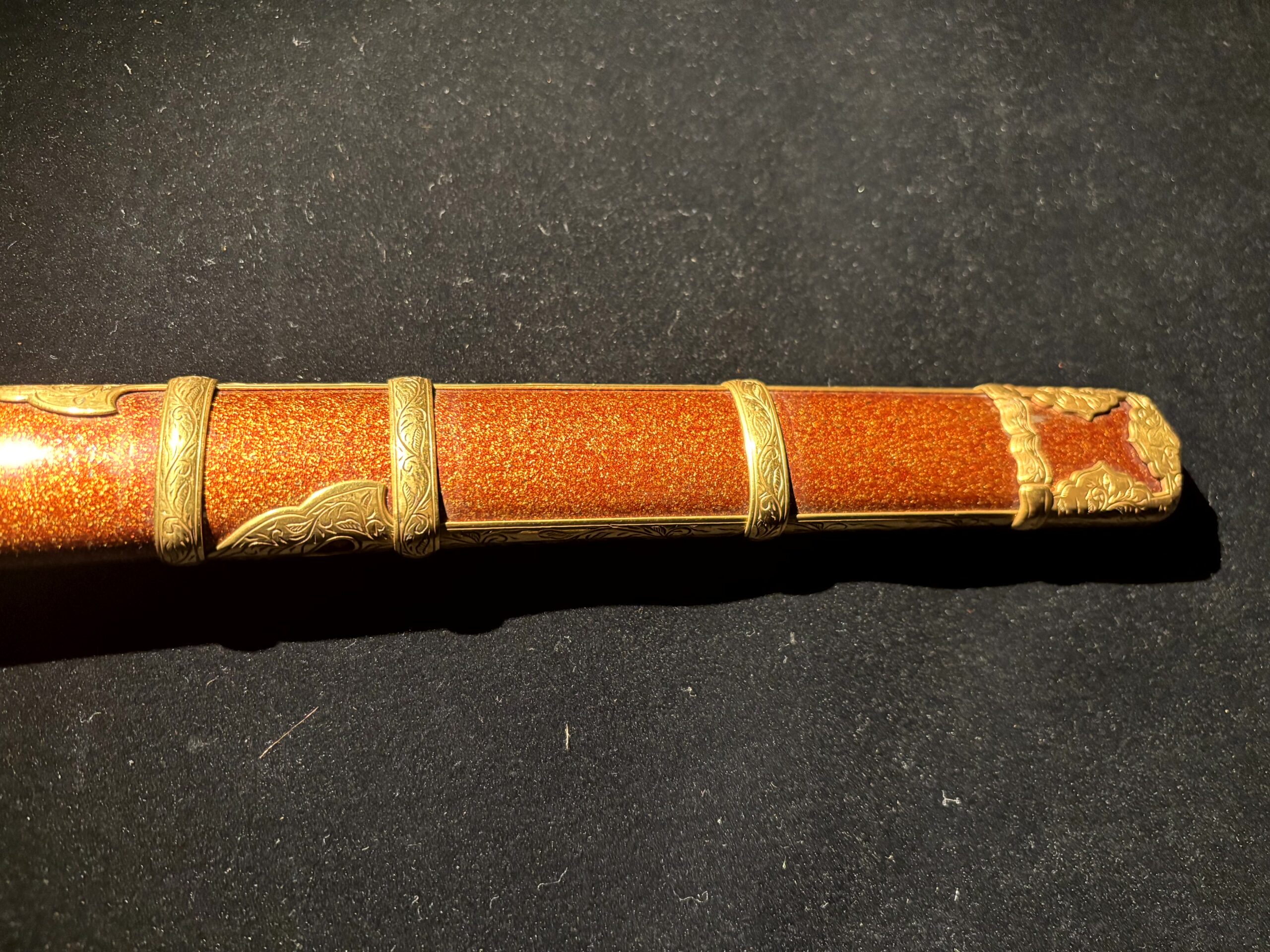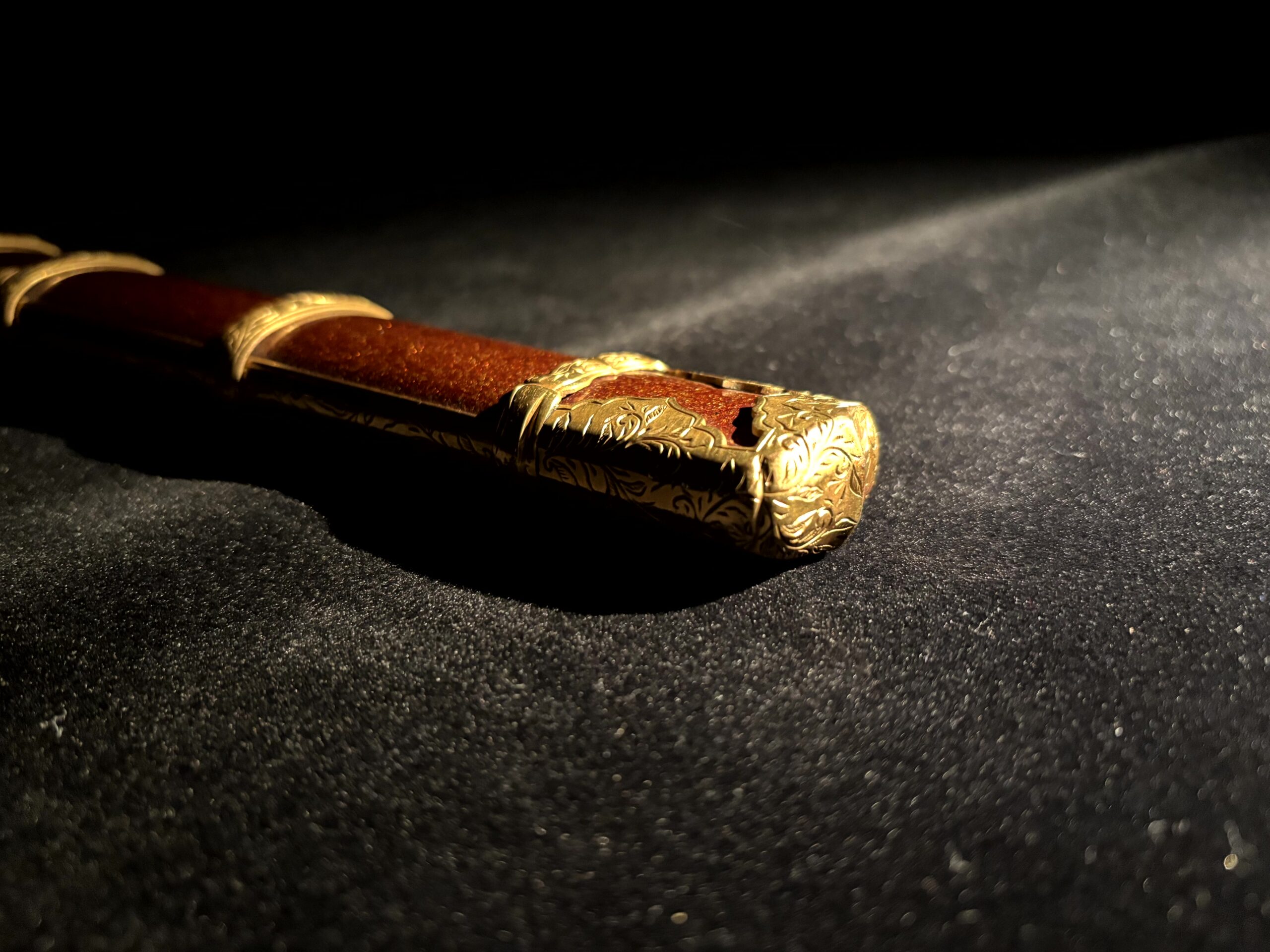 Passende goldene Beschläge erstrecken sich von der Tsuka bis zur Saya und verleihen dem Schwert eine luxuriöse Dekoration. Das Ergebnis ist ein makelloses und hervorragend gefertigtes Stück.