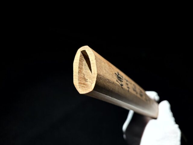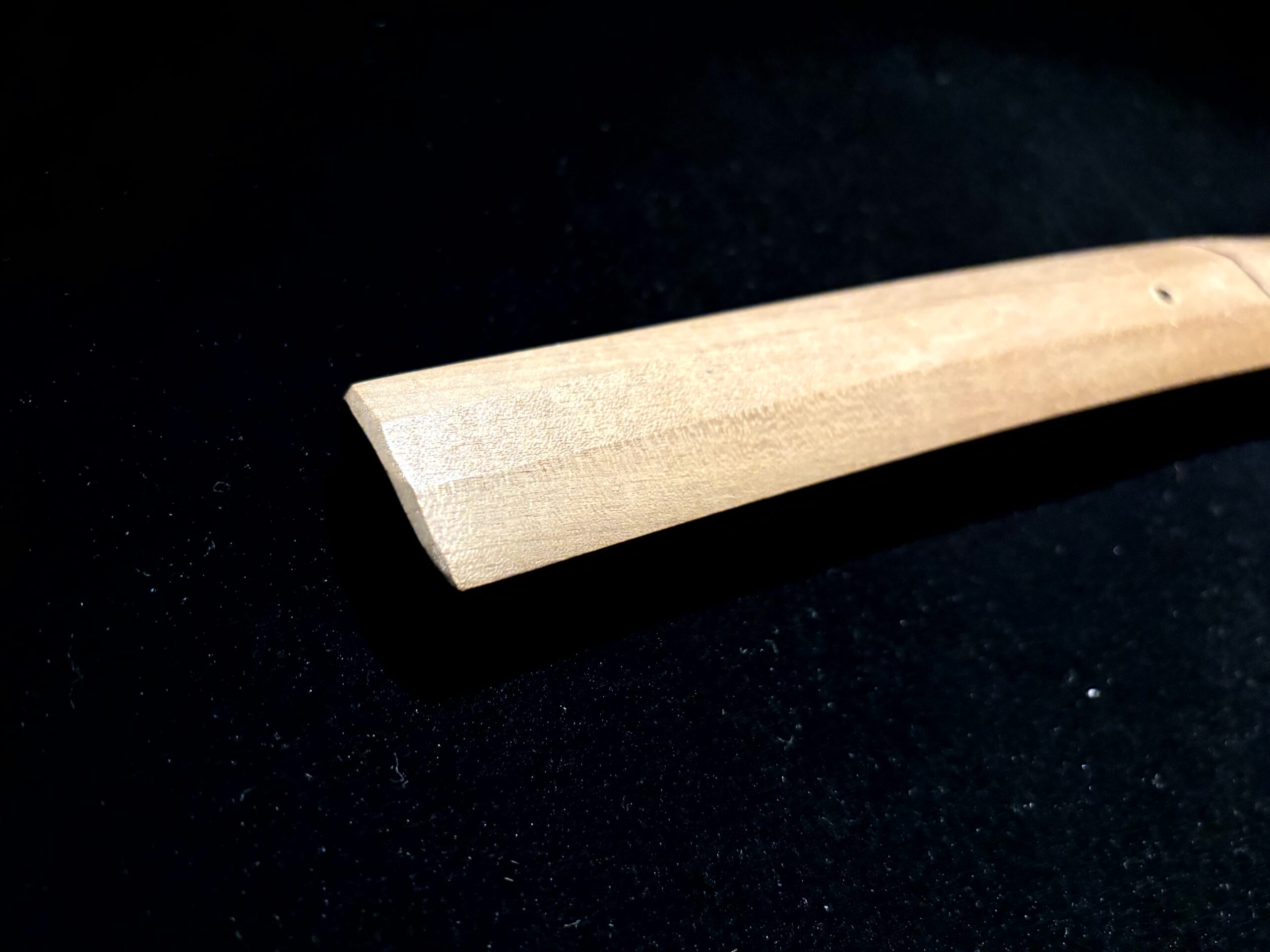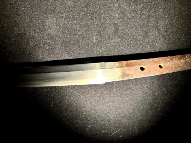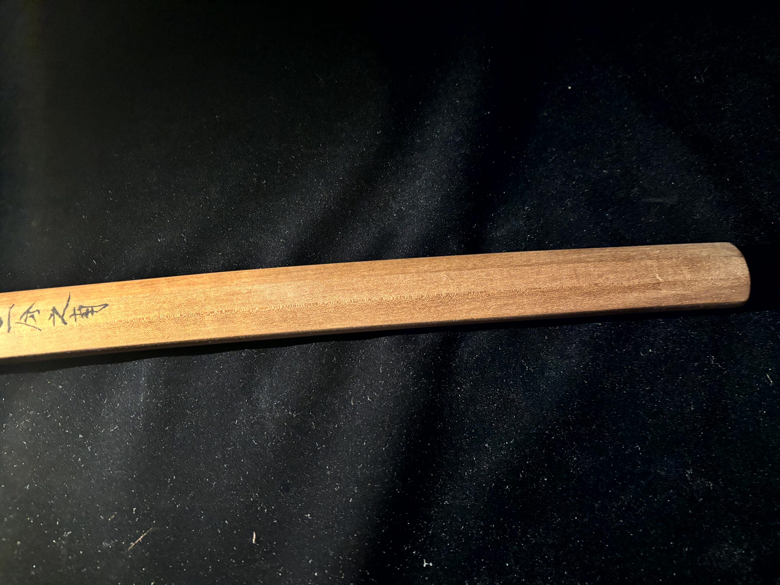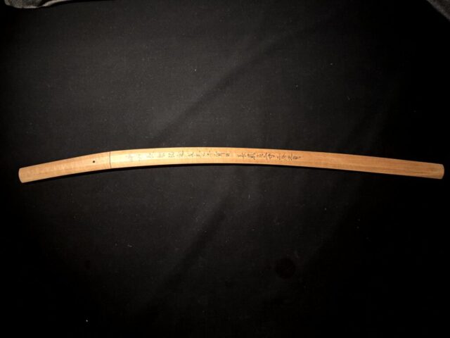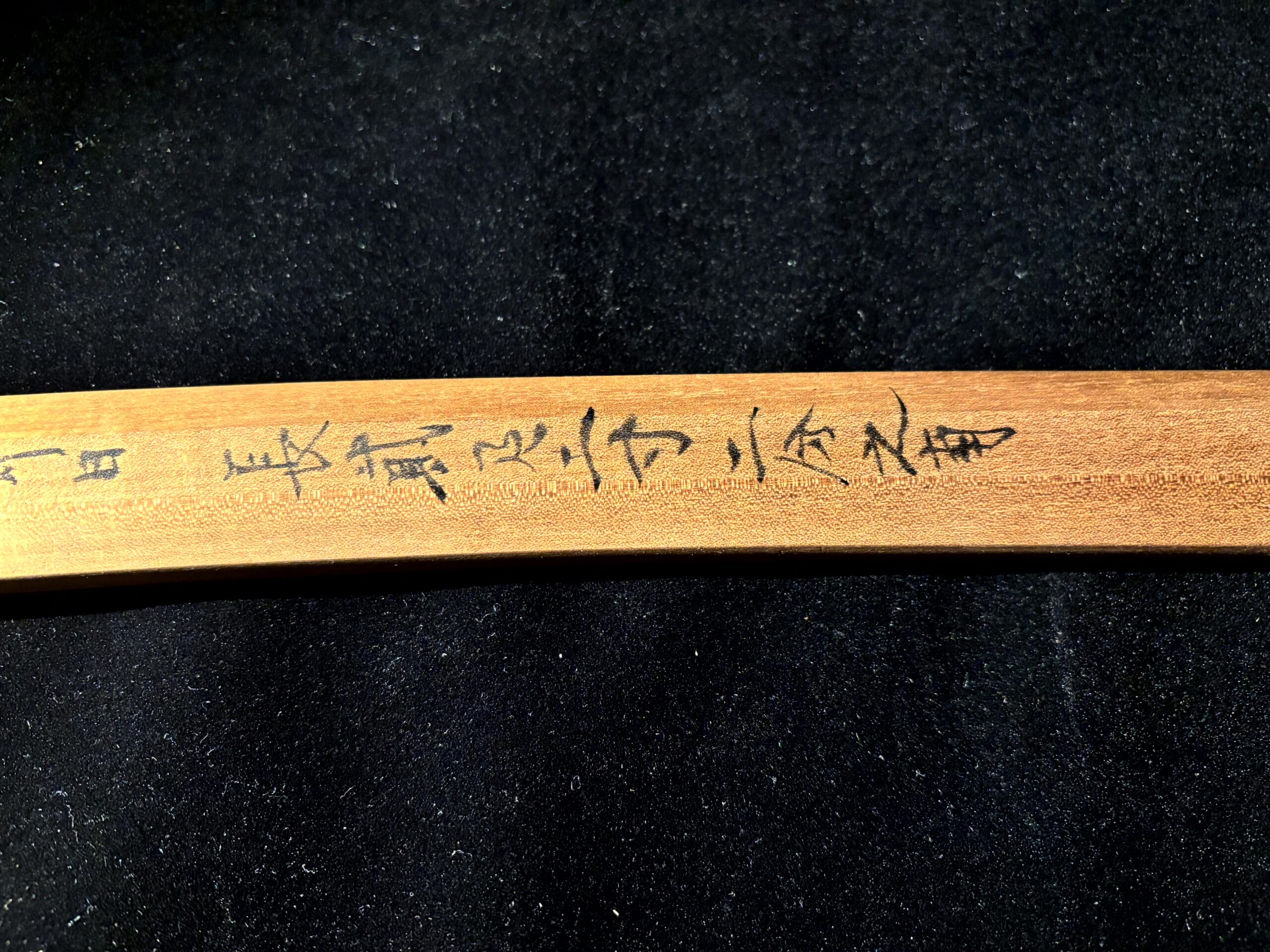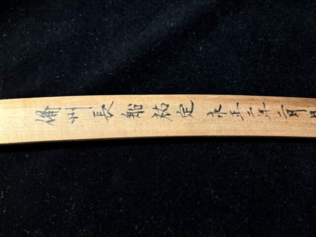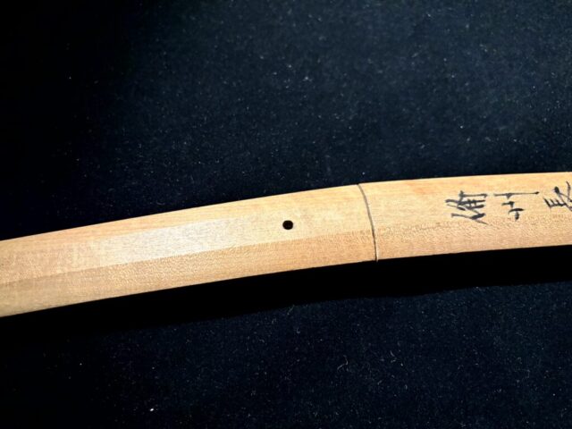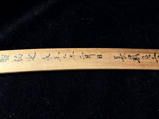 Darüber hinaus enthält die begleitende Shirasaya(schlichter Holzscheide zur Aufbewahrung)eine Inschrift(Sayagaki), die lautet: