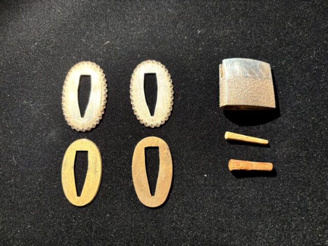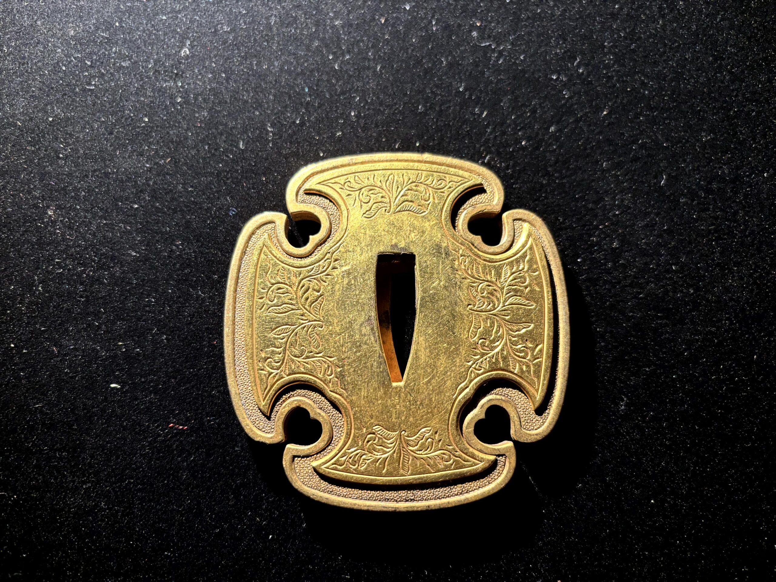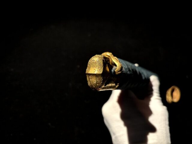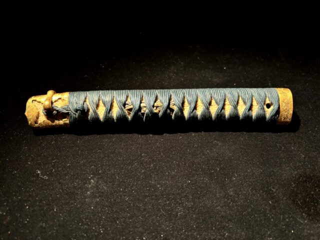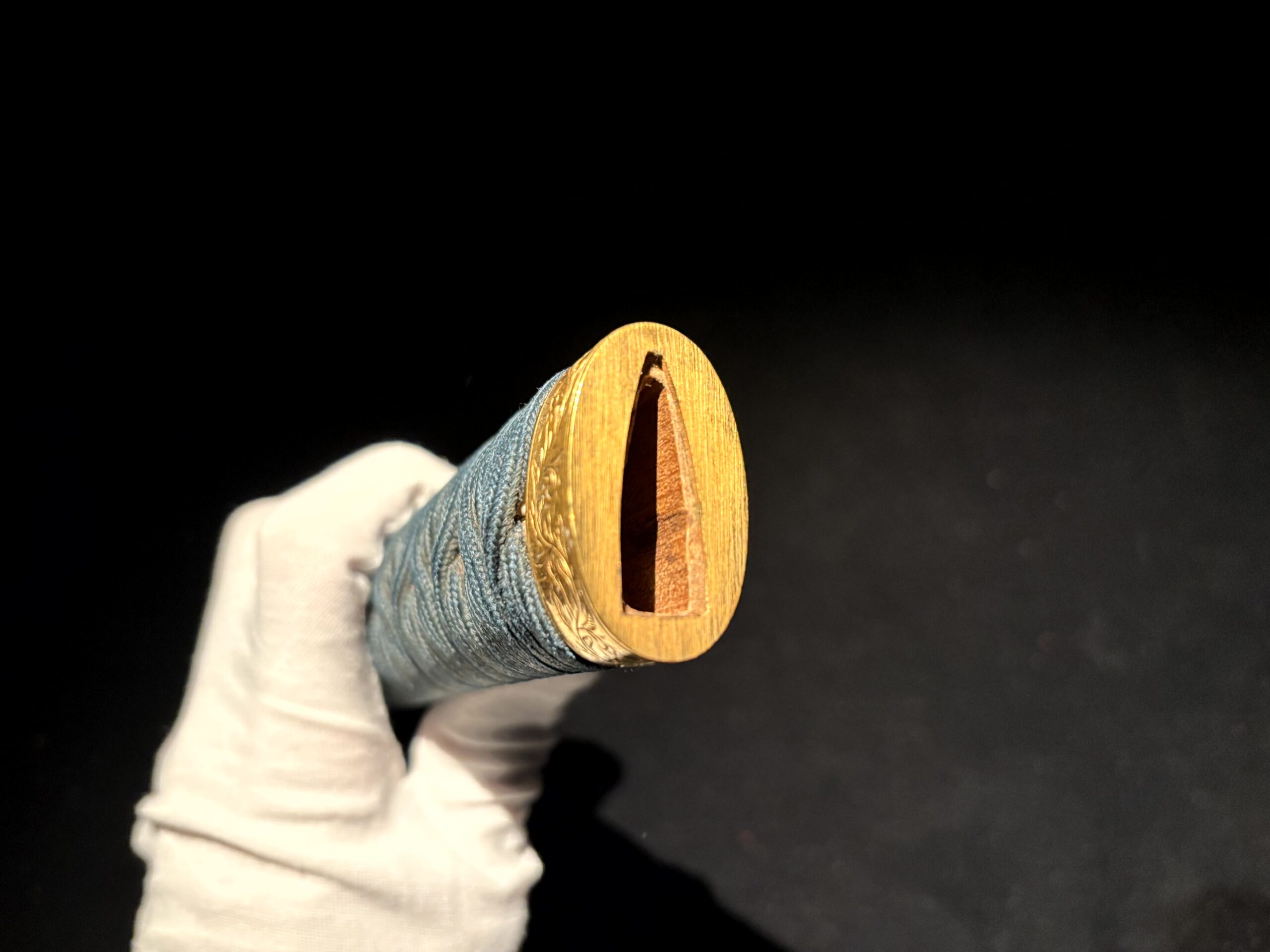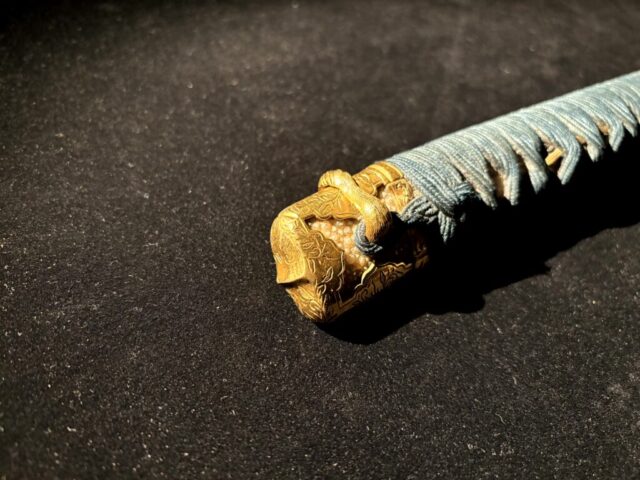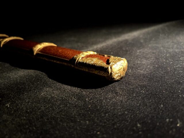 Die Tsuba(Parierstange)erstrahlt in goldenem Glanz und fesselt alle, die sie betrachten. Neben ihrer visuellen Schönheit hat sie auch ein deutliches Gewicht in der Hand und vermittelt ein Gefühl von Solidität und Präsenz.