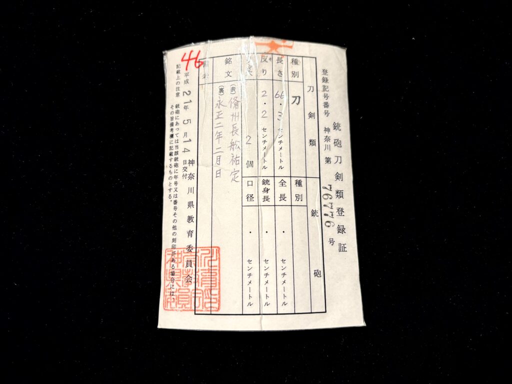 Alle echten Katanas sind offiziell beim Bildungsamt der jeweiligen Präfektur registriert und werden mit einem Registrierungszertifikat geliefert. Dieses Katana wird ebenfalls mit seinem Registrierungszertifikat geliefert, wie auf dem beigefügten Bild zu sehen.