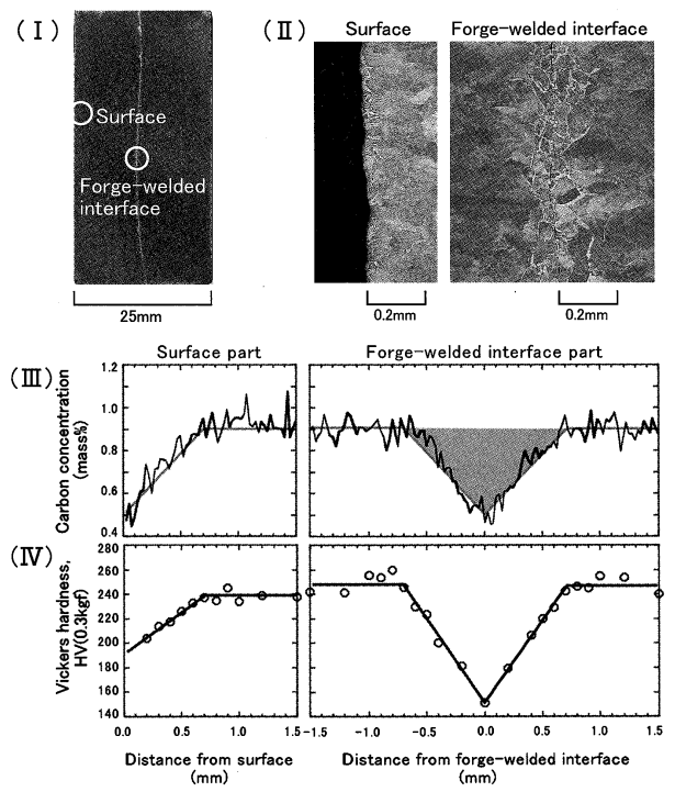 Graph(III)zeigt den Kohlenstoffgehalt und offenbart, dass dieser an der Oberfläche und den Faltschichten des Stahls abnimmt.