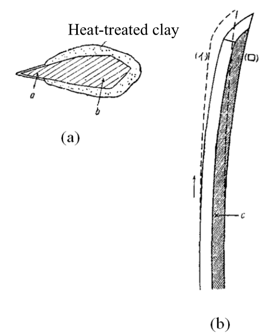 Comme illustré en (a), une fine couche d’argile (yakibatsuchi) est appliquée sur le côté tranchant de la lame, lui permettant de refroidir rapidement et de subir une transformation martensitique.