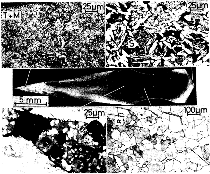 La zone du tranchant présente de la martensite, les flancs de la troostite, le cœur est composé de ferrite, et le dos est constitué de sorbite.