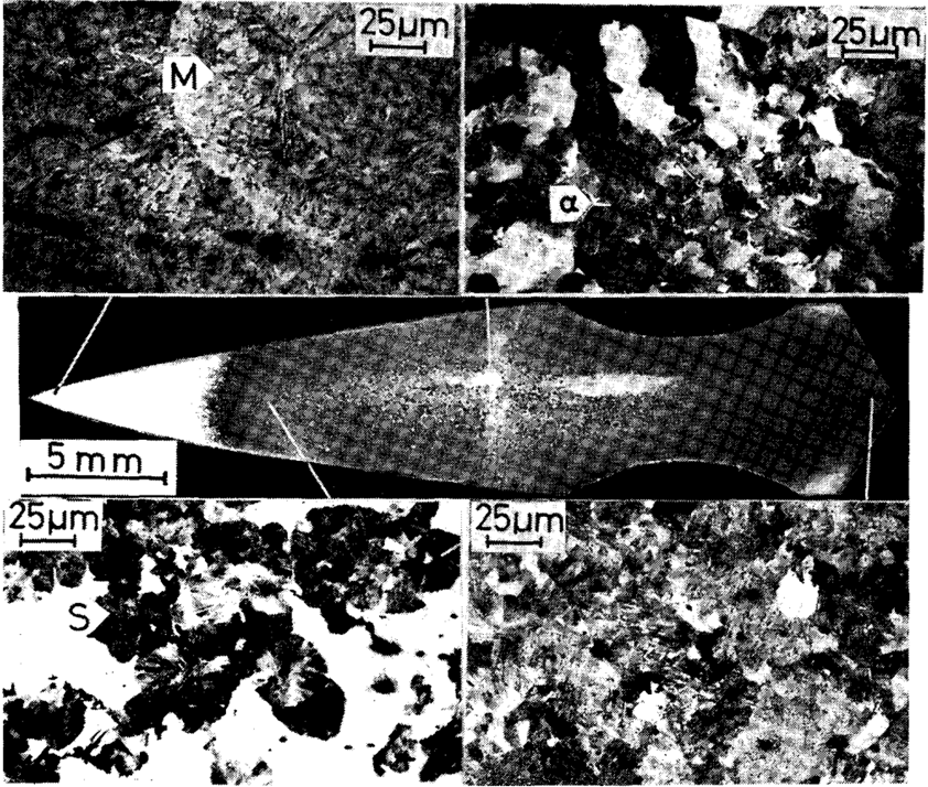 Si la zone du tranchant est composée de martensite, sa structure aciculaire est plus grossière que celle des autres sabres. En dessous se trouve de la sorbite, et dans la macrostructure, une zone blanche est visible près du centre, correspondant probablement à de la perlite contenant de la ferrite disséminée.