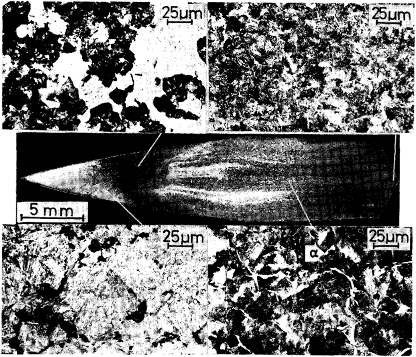 Le tranchant est composé de martensite, qui se transforme en une région de troostite + martensite, pour finalement devenir riche en ferrite plus profondément dans la lame. Dans le cœur (shingane), on observe très peu de perlite, ce qui indique une composition à faible teneur en carbone. Vers le dos (mune), la structure revient à une phase à haute teneur en carbone, présentant un mélange de ferrite et de sorbite.