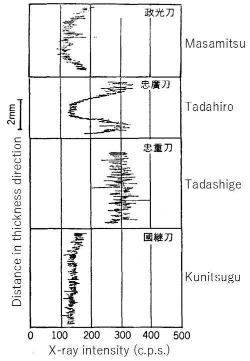 De plus, des fluctuations répétitives des niveaux de carbone apparaissent tous les 2–3 mm, qui correspondent vraisemblablement aux traces du forgeage répété par repliement (orikaeshi-tanren).