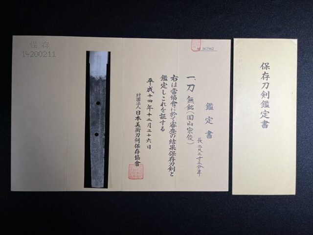 Ce Katana a été certifié Tokubetsu Hozon Token (特別保存刀剣) par le NBTHK (Nihon Bijutsu Token Hozon Kyokai), l’organisation d’expertise en sabres la plus prestigieuse du Japon.