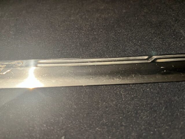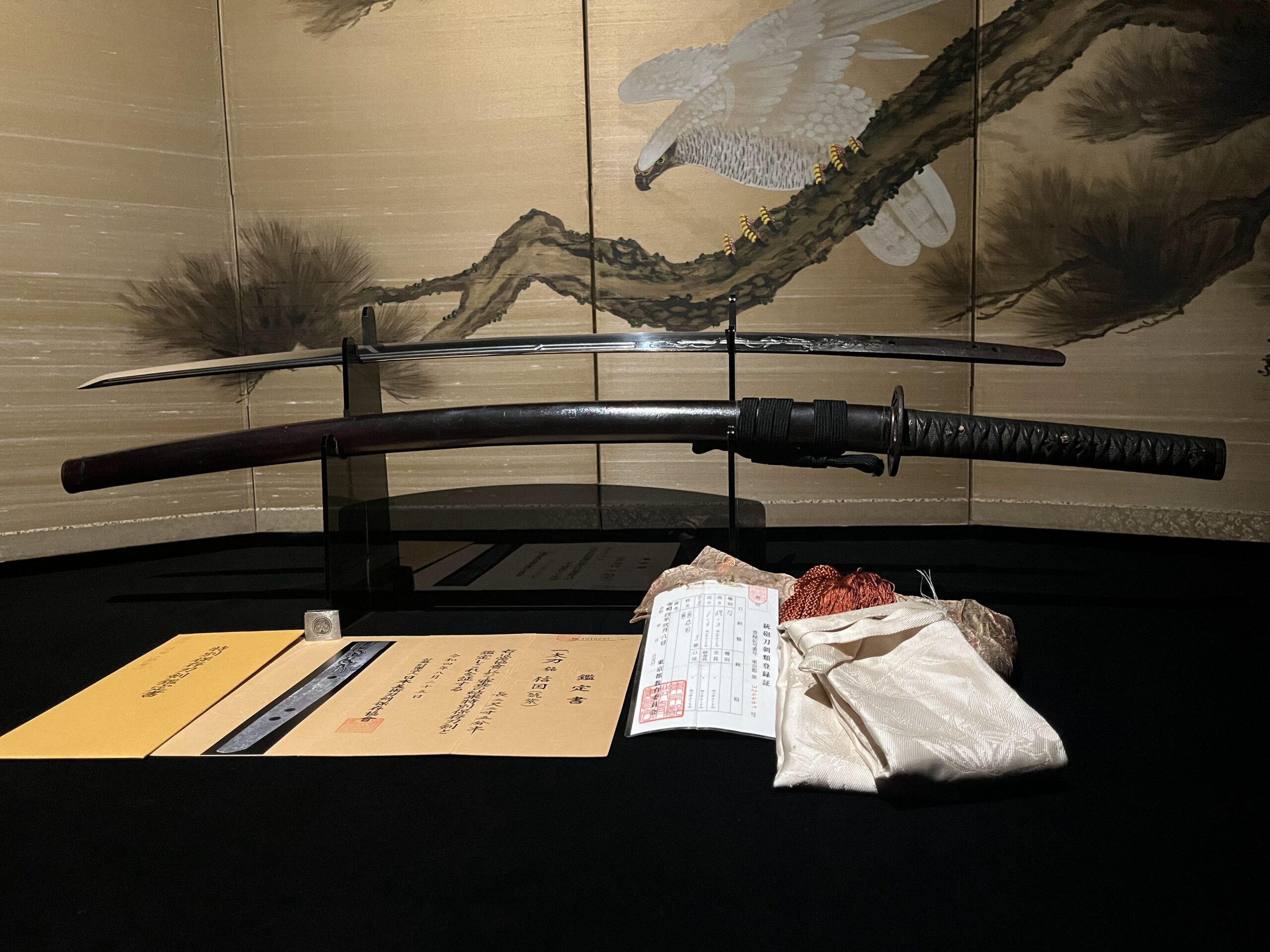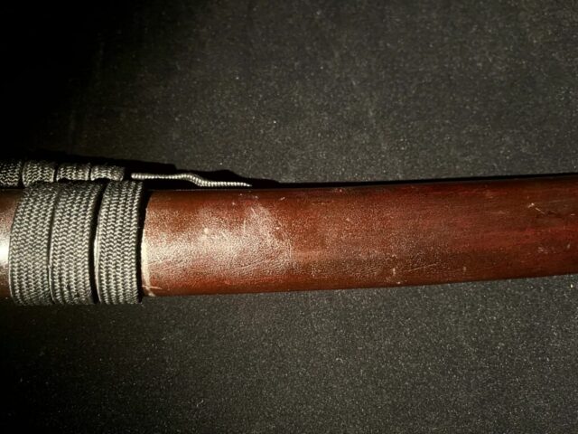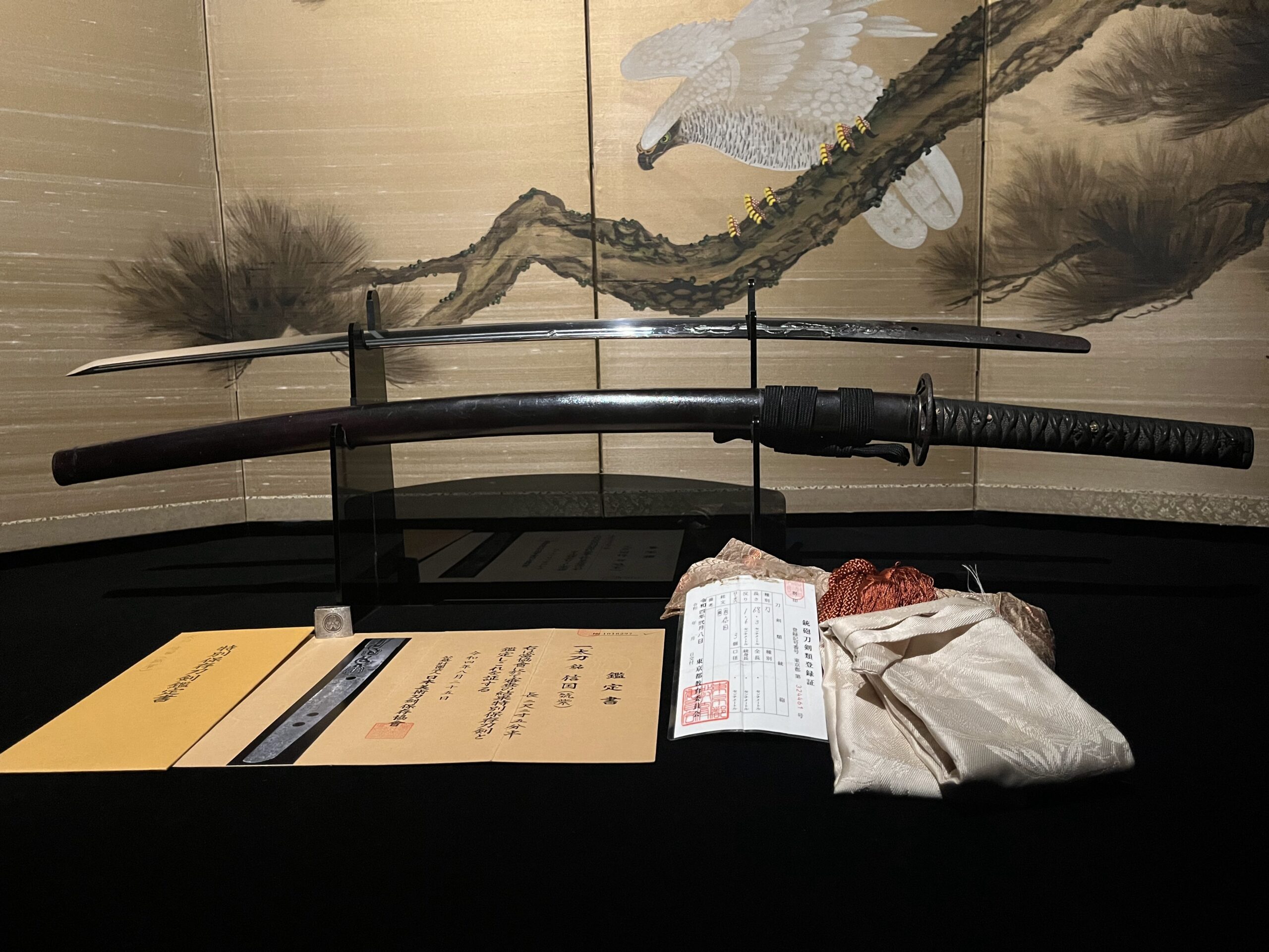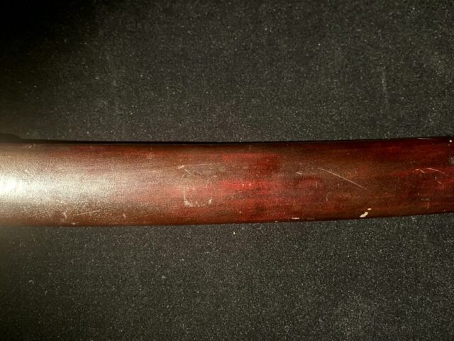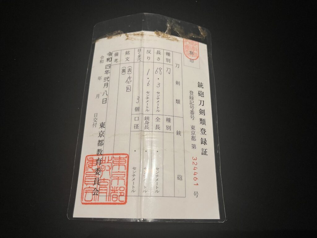 Tous les vrais Katanas sont officiellement enregistrés auprès du Conseil de l’éducation de la préfecture dans laquelle ils se trouvent, et chacun est accompagné d’un certificat d’enregistrement. Ce Katana est lui aussi livré avec son certificat d’enregistrement, comme l’illustre l’image ci-jointe.
