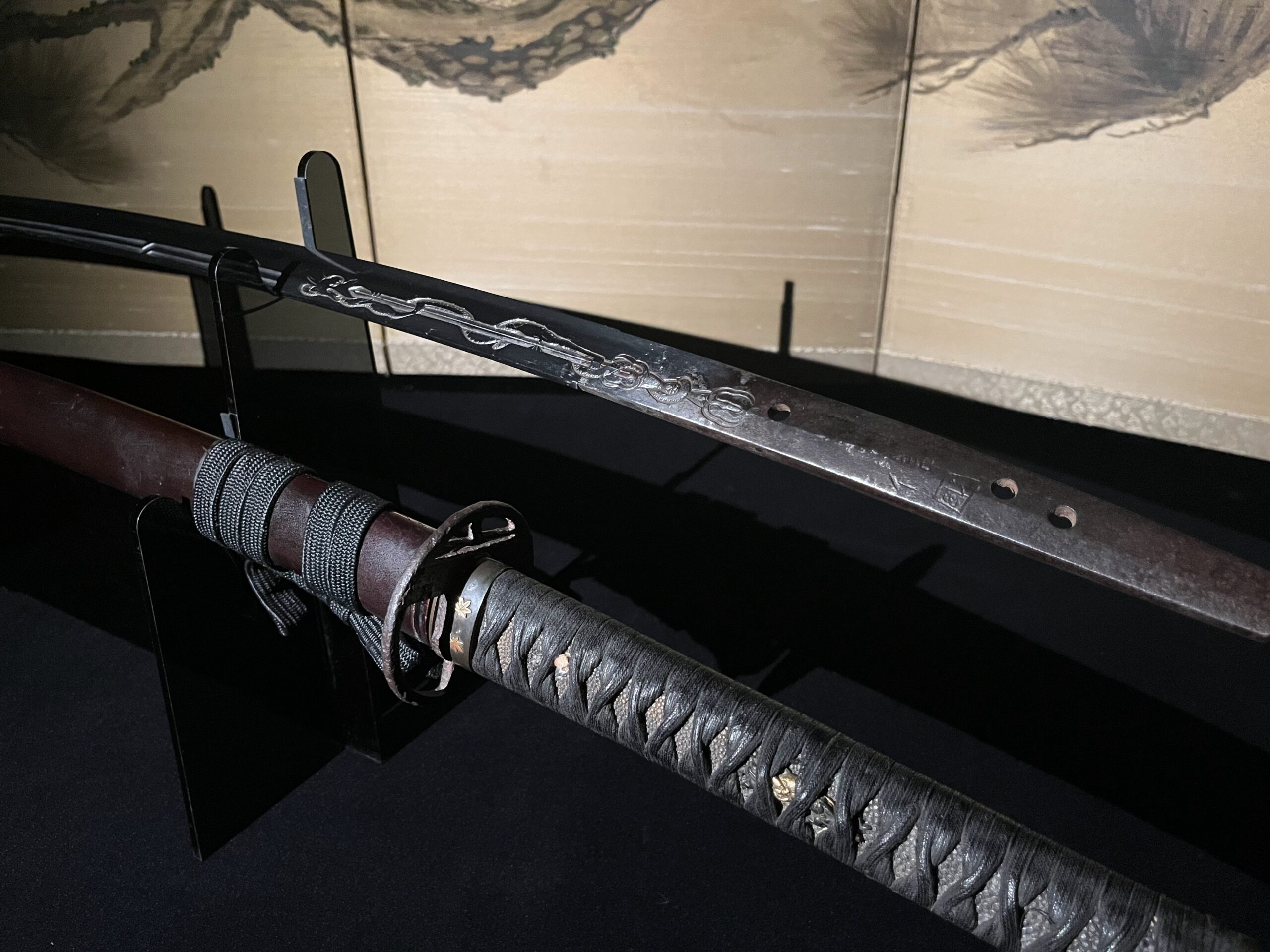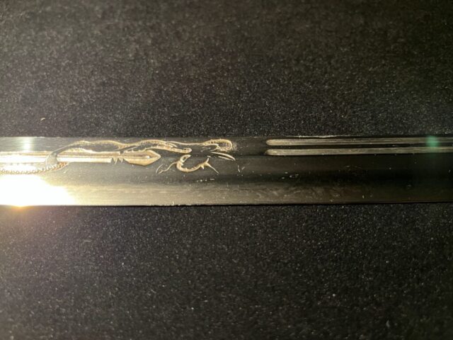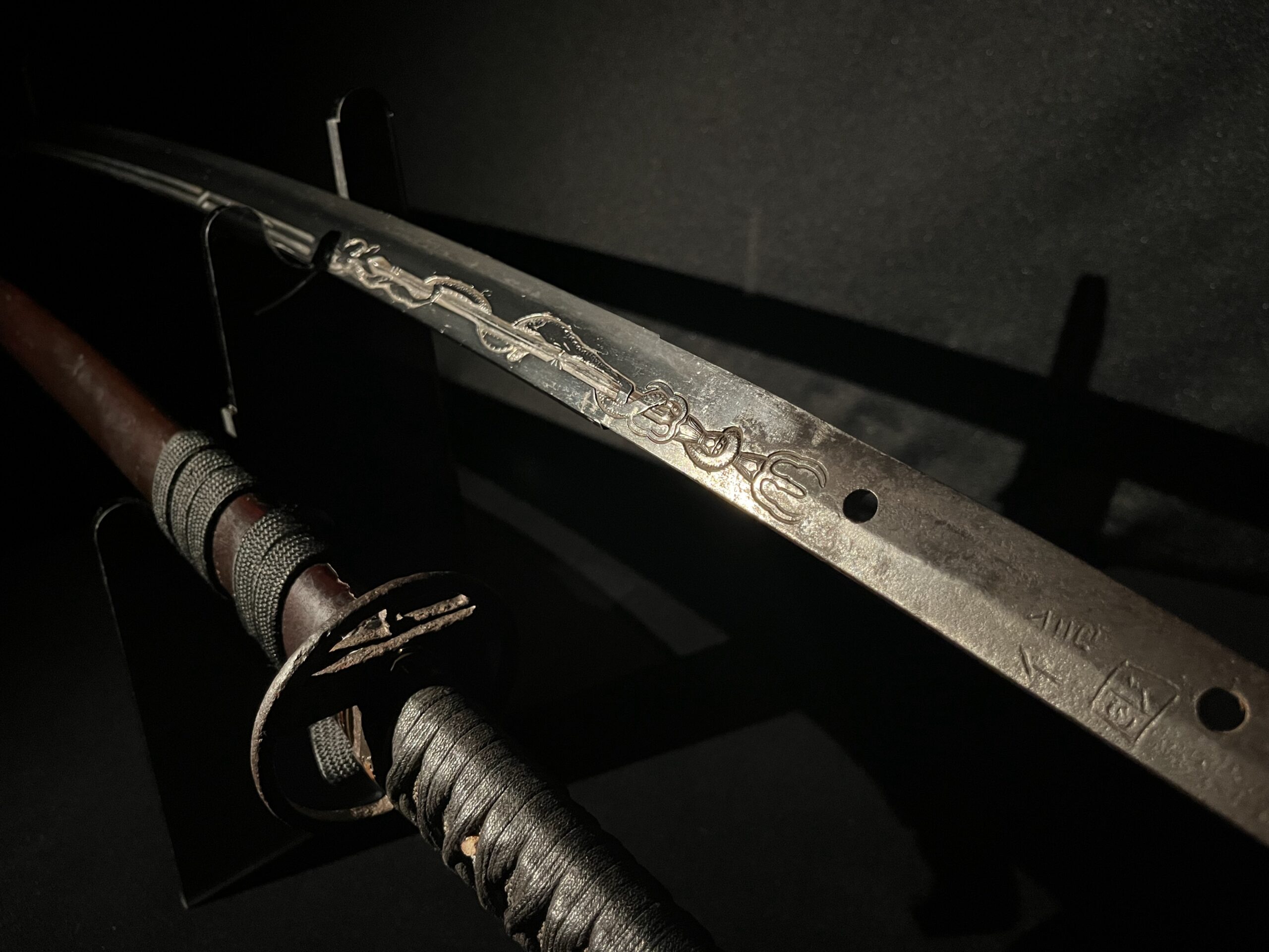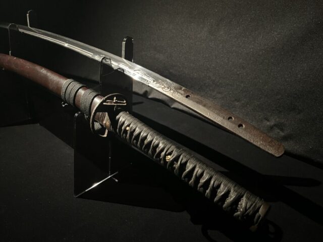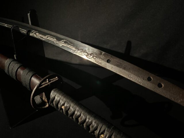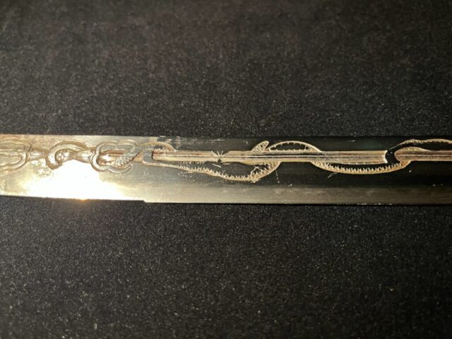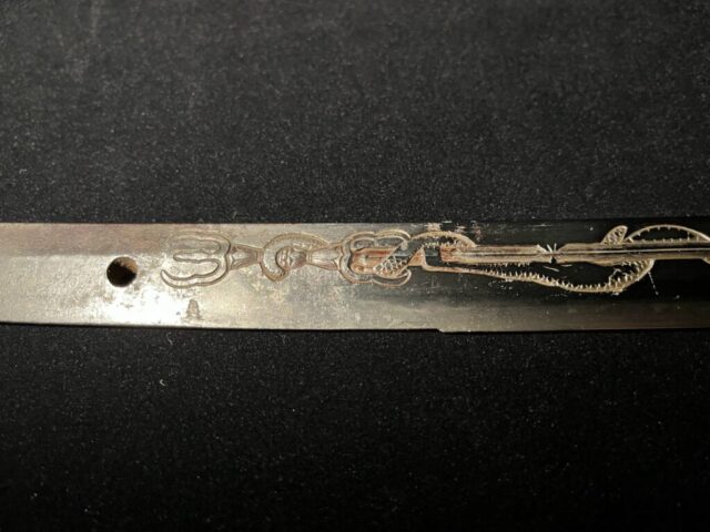 La lame de ce Katana est ornée d’une sculpture d’une beauté et d’une finesse exceptionnelles, connue sous le nom de « Kurikara ».