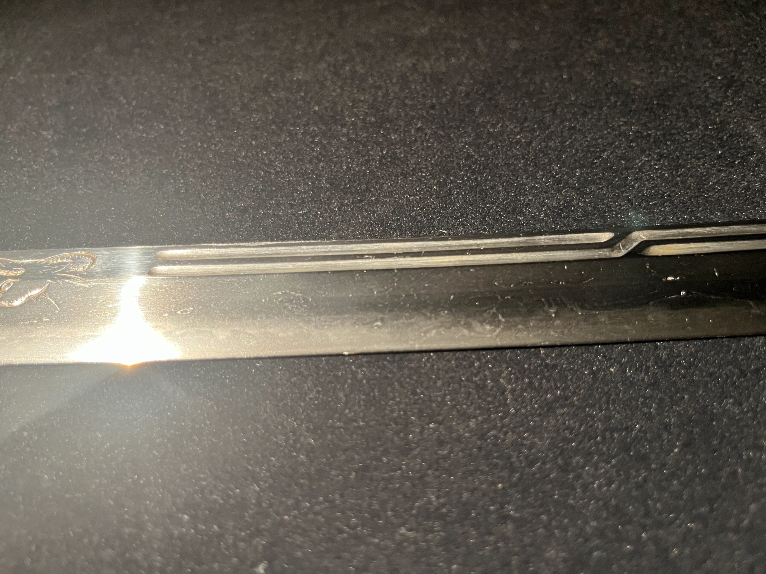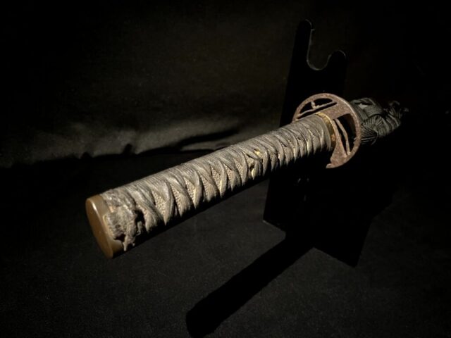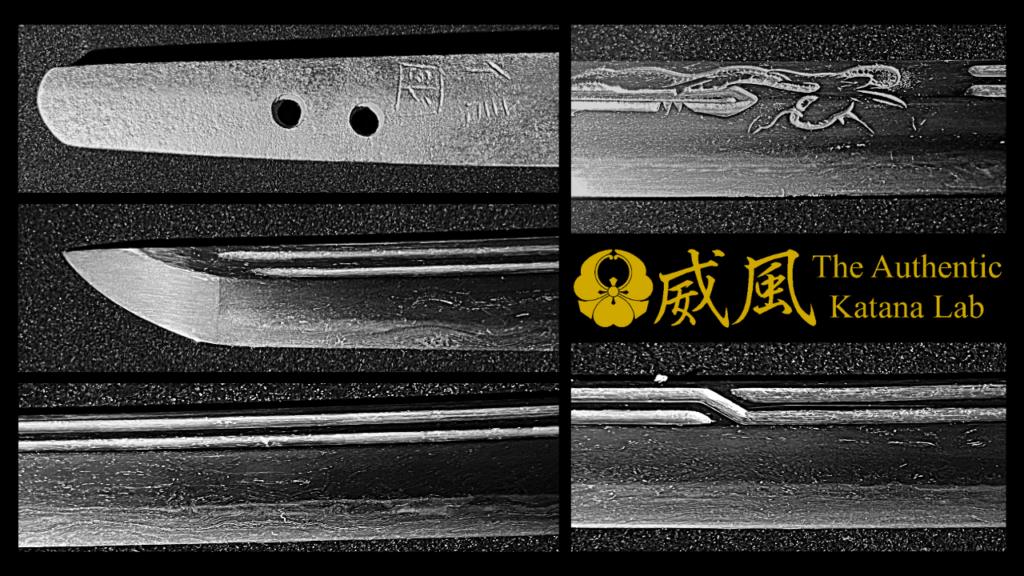 Très peu de leurs œuvres ont survécu jusqu’à aujourd’hui, ce qui confère à chaque pièce existante une valeur considérable — et celle-ci se distingue davantage encore par la sculpture de dragon gravée sur la lame, une caractéristique quasi inédite dans les sabres Nobukuni.