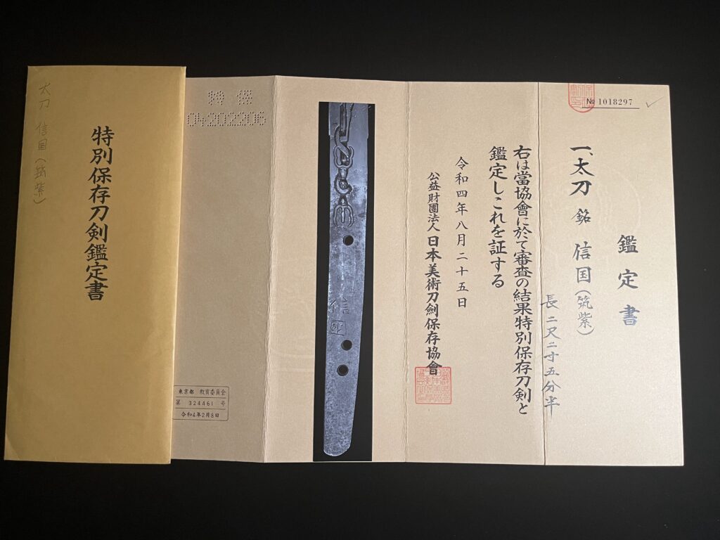 Ce Katana a été certifié Tokubetsu Hozon Token (特別保存刀剣) par le NBTHK (Nihon Bijutsu Token Hozon Kyokai), une organisation de référence au Japon dédiée à la préservation des sabres japonais. Cette distinction est attribuée aux sabres reconnus pour leur haute qualité d’artisanat et leur excellent état de conservation. Elle est supérieure à la certification ordinaire Hozon Token (保存刀剣), attestant d’un niveau d’expertise plus élevé. (Le certificat officiel est inclus dans l’ensemble.)