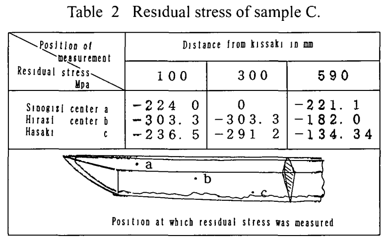 Bien que la mesure au point situé à 300 mm de la pointe (kissaki) ait révélé une contrainte résiduelle de compression étonnamment faible, le reste de la lame présentait uniformément une contrainte de compression sur toute sa surface.
